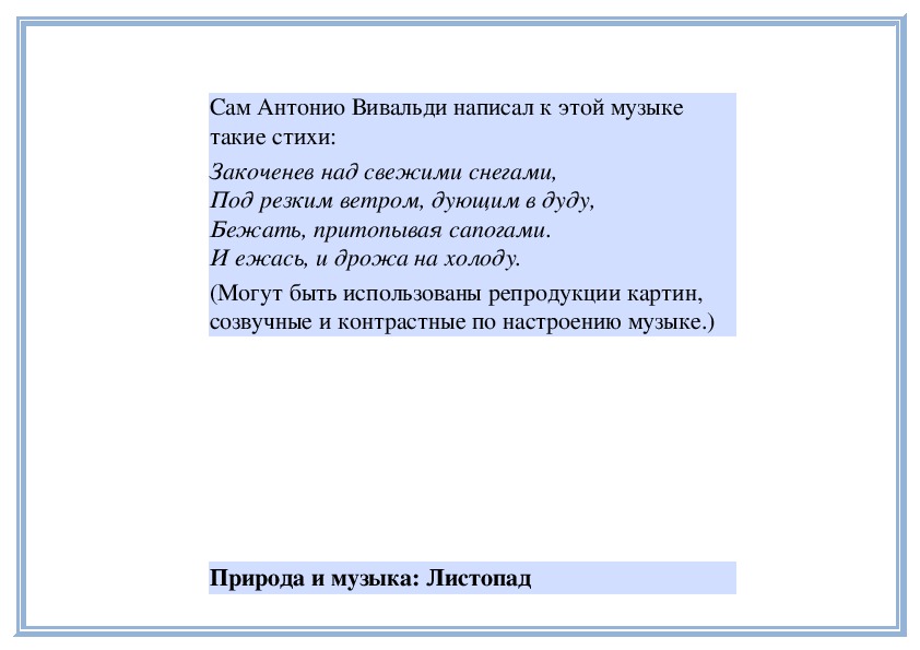 П е д а г о г. Вы хорошо знаете имя великого русского композитора - Петра Ильича Чайковского, знакомы с некоторыми его произведениями из «Детского альбома», цикла «Времена года». Музыка П. Чайковского так прекрасна, что вы наверняка будете с удовольствием слушать её в разные годы своей жизни.