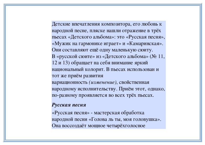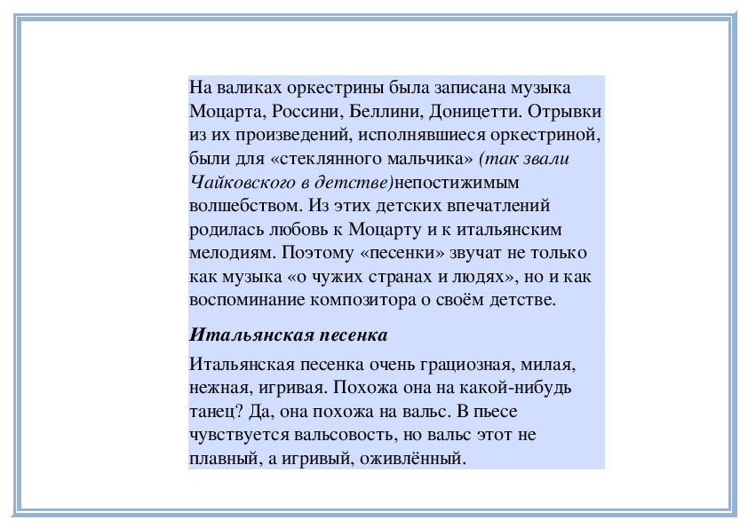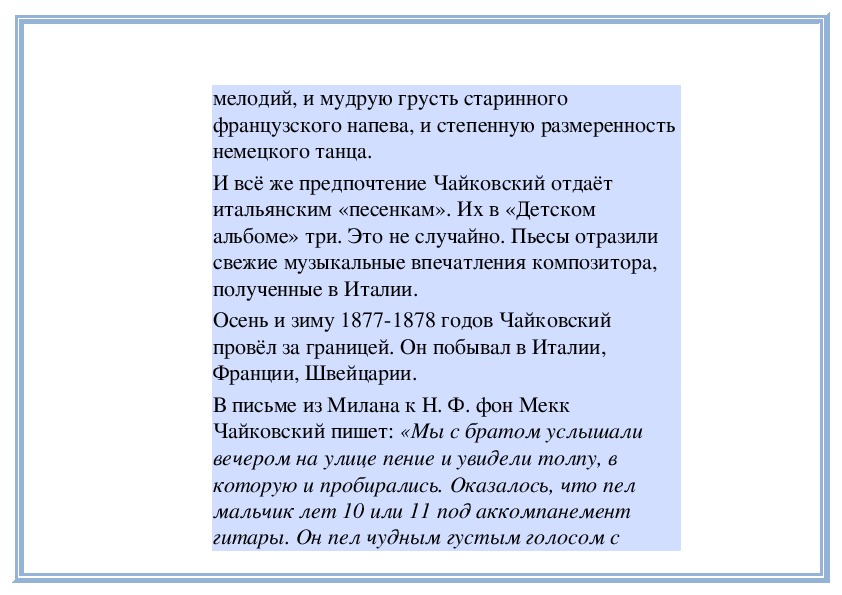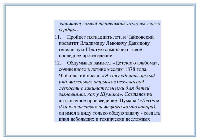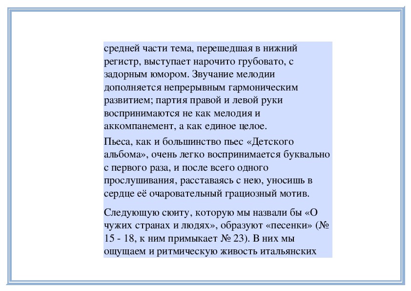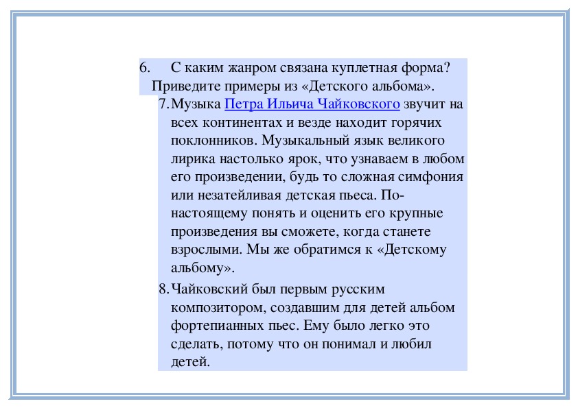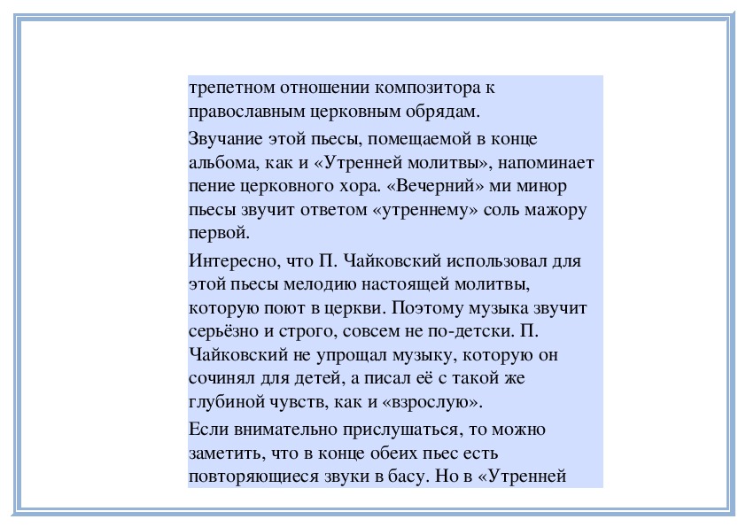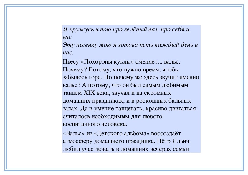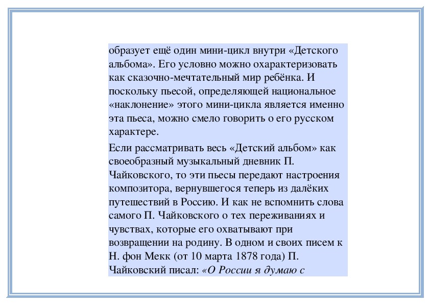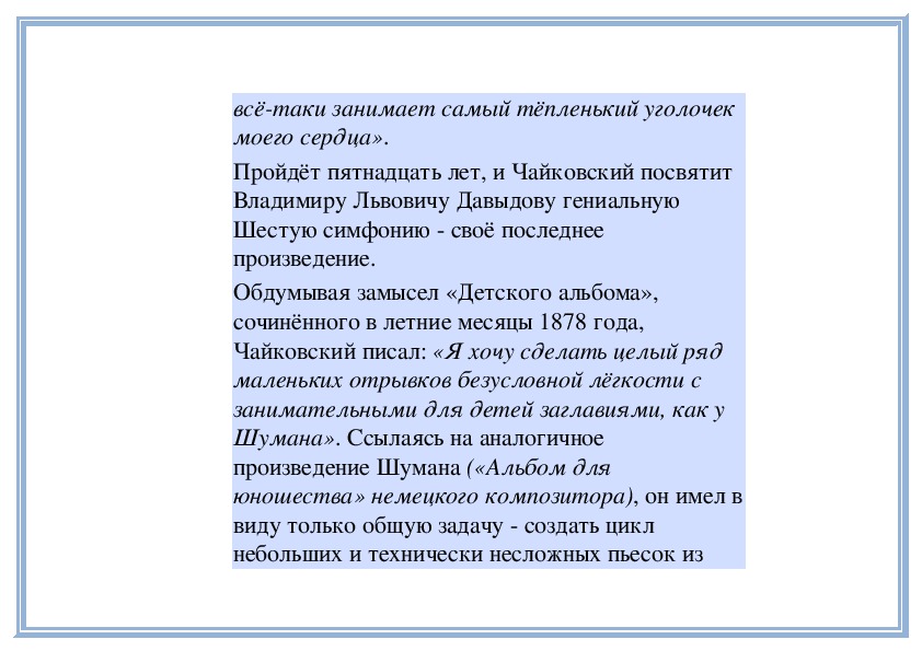 Музыка Петра Ильича Чайковского звучит на всех континентах и везде находит горячих поклонников. Музыкальный язык великого лирика настолько ярок, что узнаваем в любом его произведении, будь то сложная симфония или незатейливая детская пьеса. По-настоящему понять и оценить его крупные произведения вы сможете, когда станете взрослыми. Мы же обратимся к «Детскому альбому».