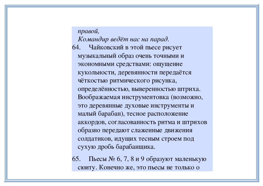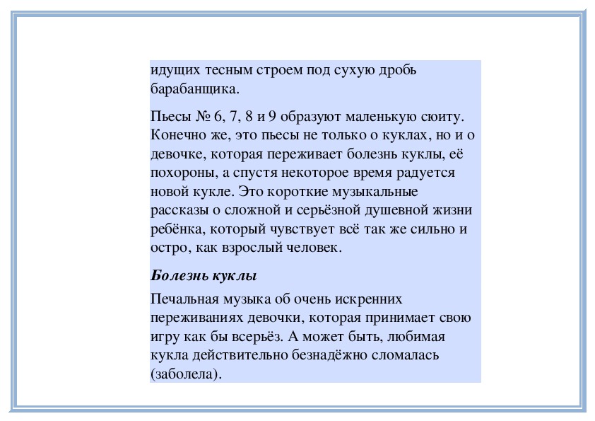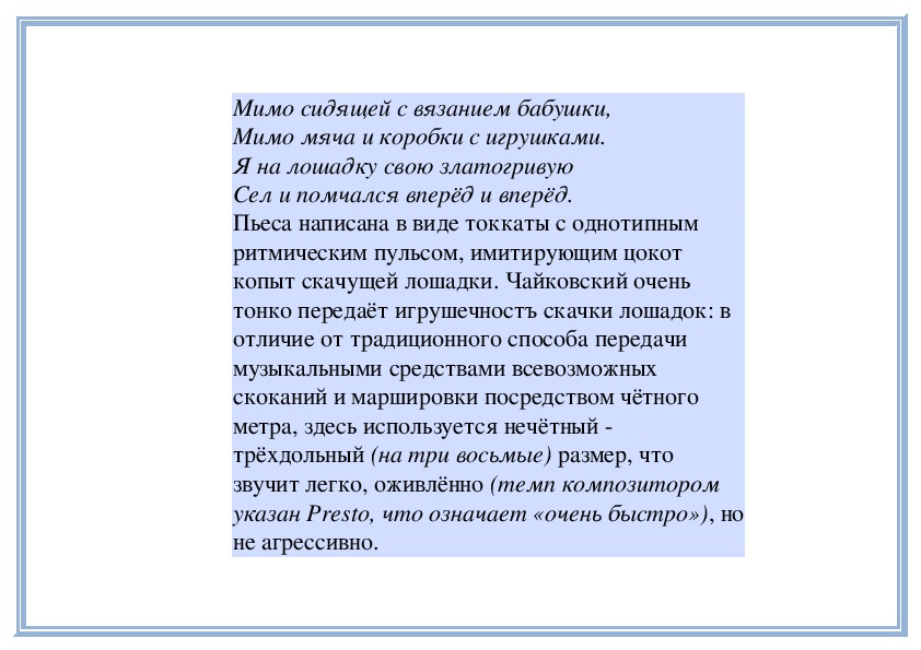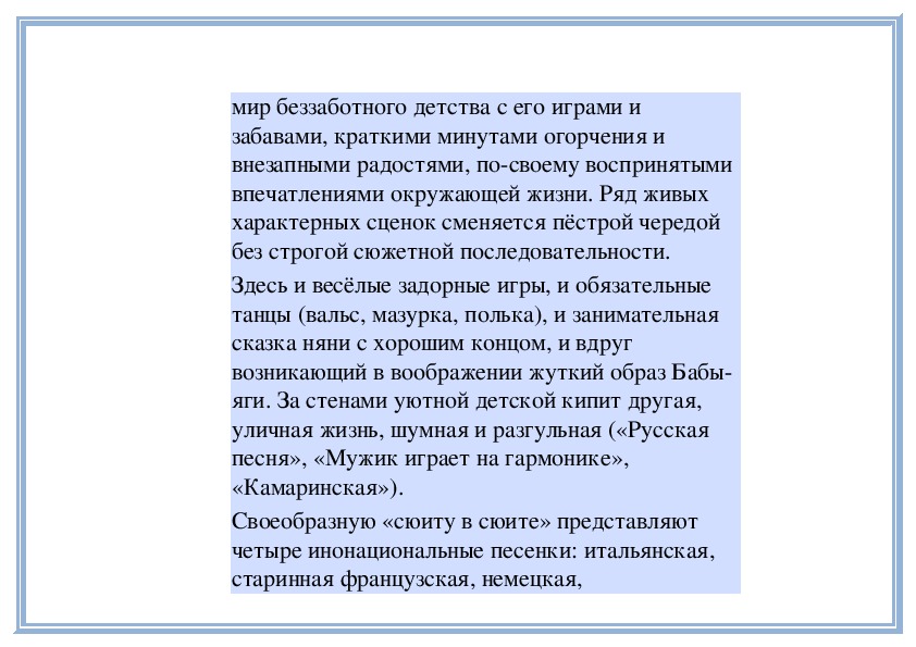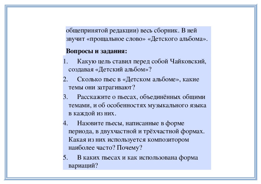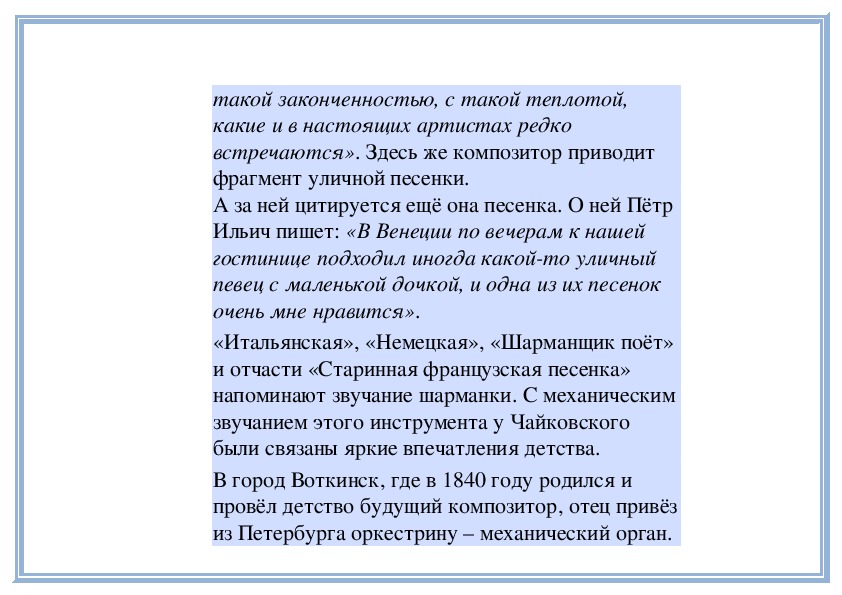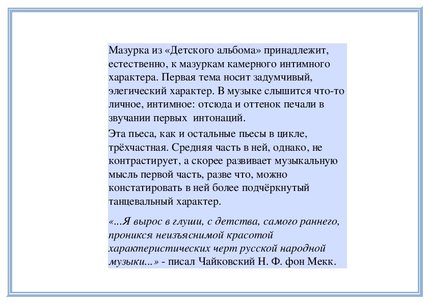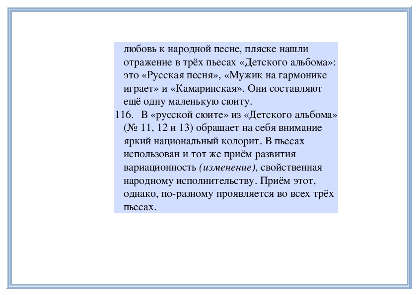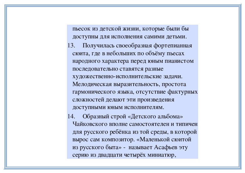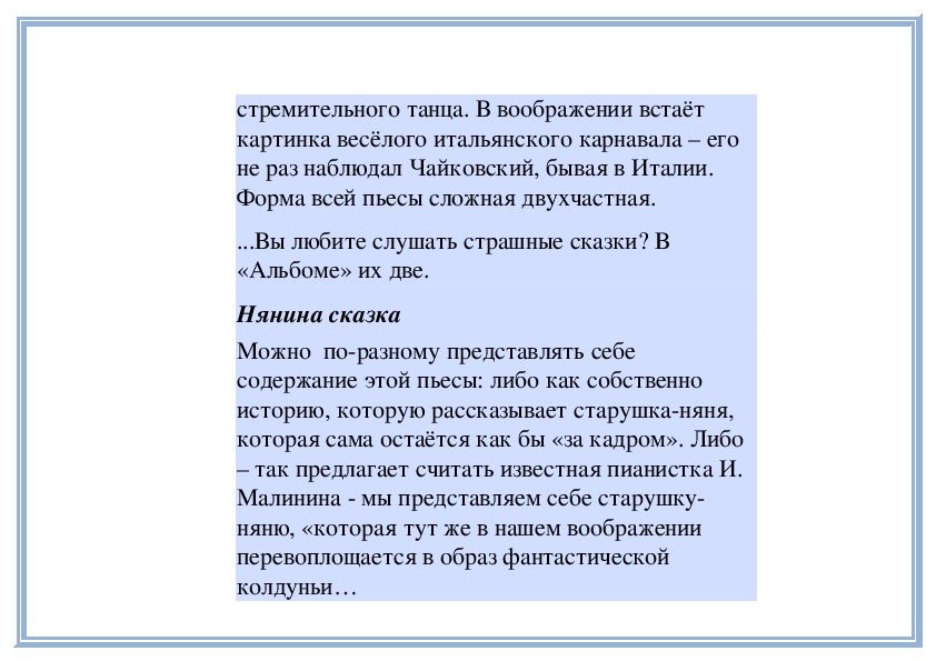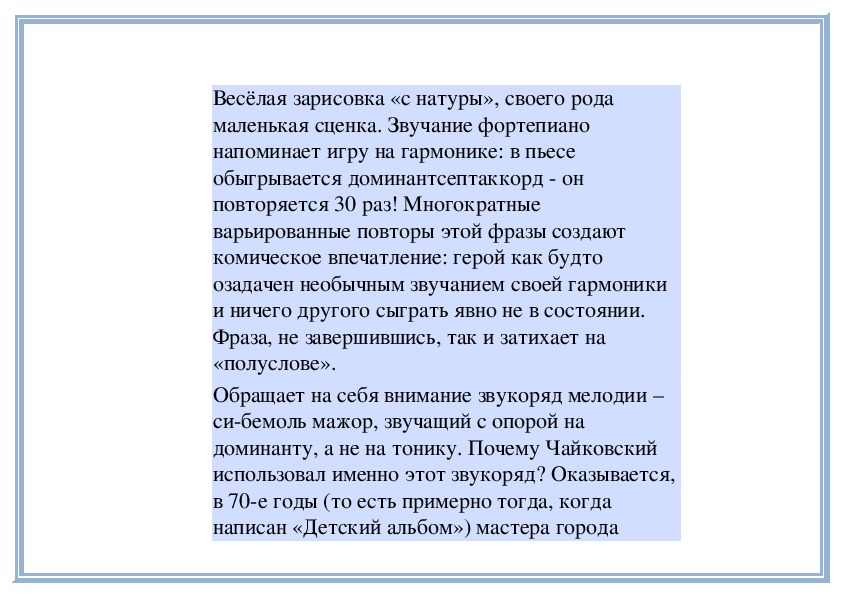 Музыка Петра Ильича Чайковского звучит на всех континентах и везде находит горячих поклонников. Музыкальный язык великого лирика настолько ярок, что узнаваем в любом его произведении, будь то сложная симфония или незатейливая детская пьеса. По-настоящему понять и оценить его крупные произведения вы сможете, когда станете взрослыми. Мы же обратимся к «Детскому альбому».