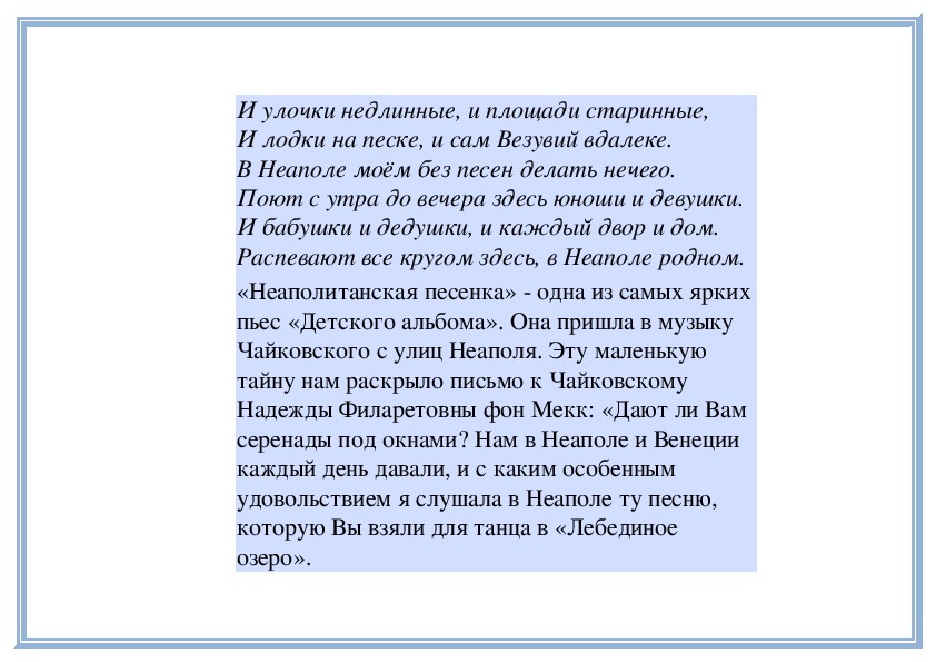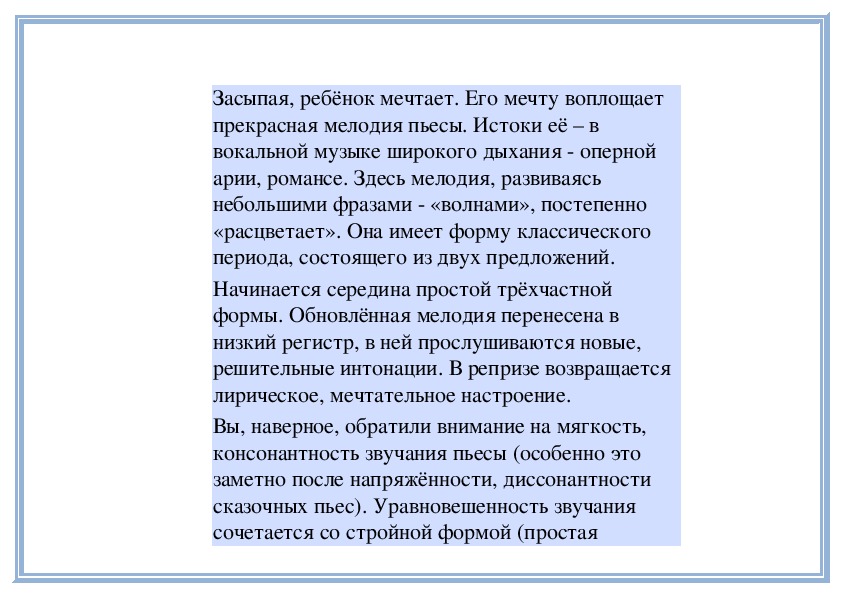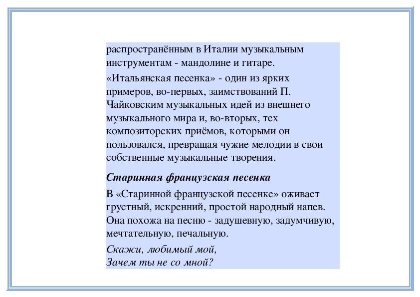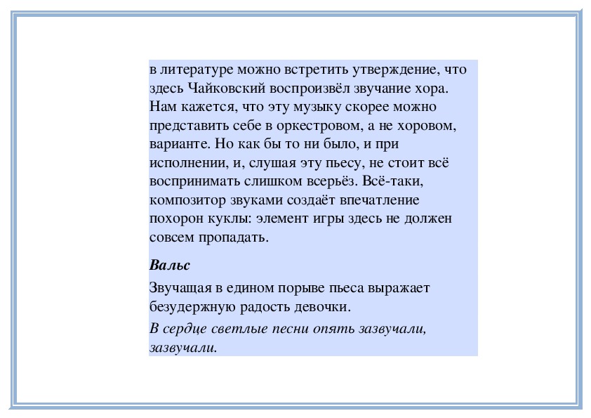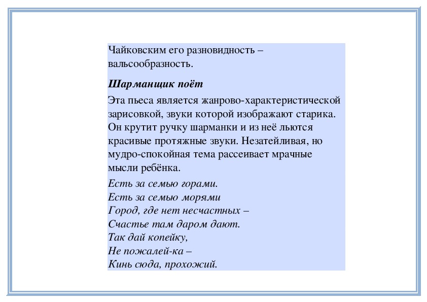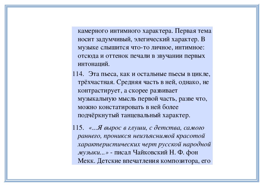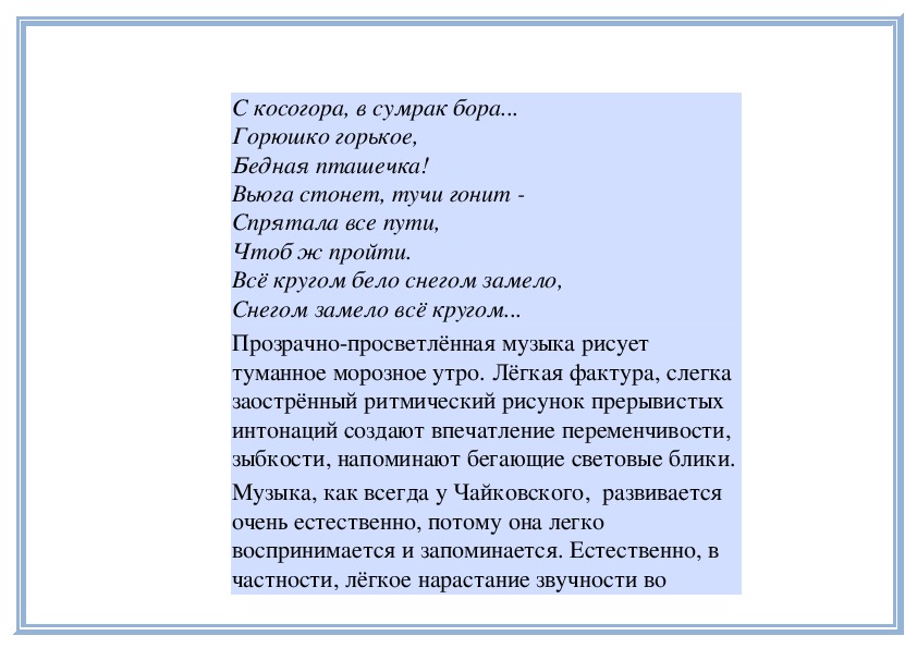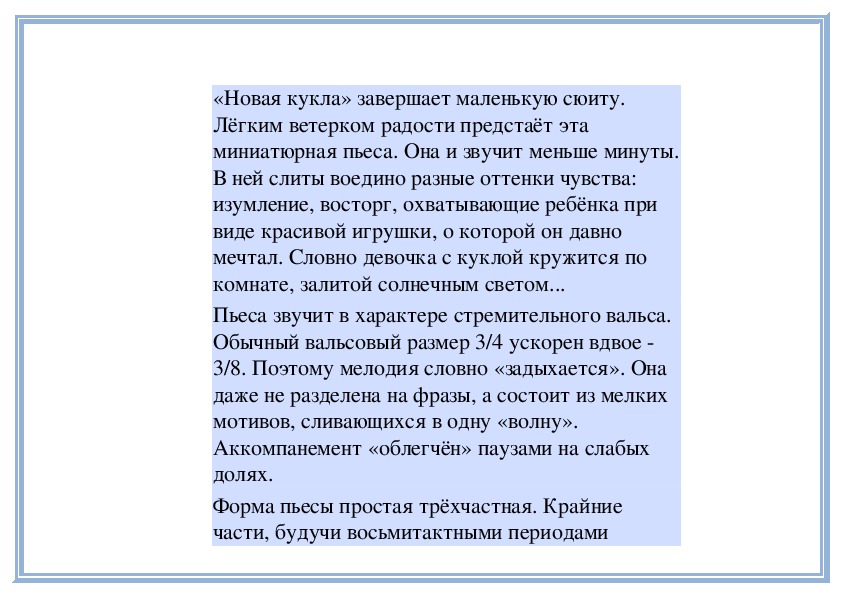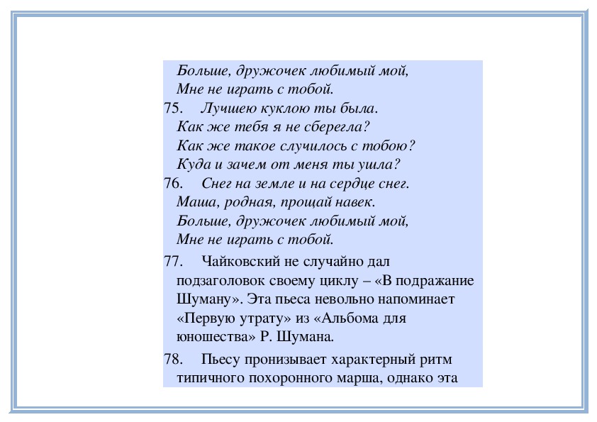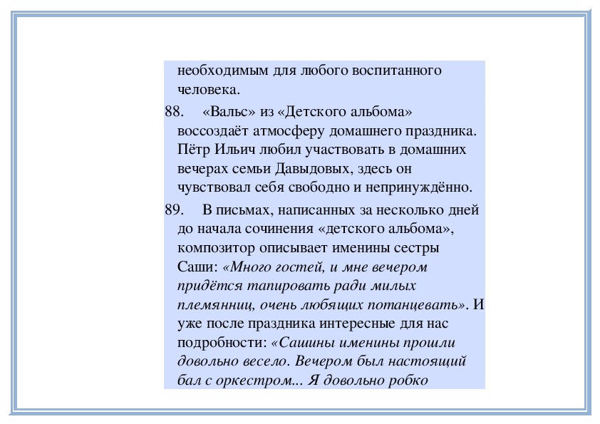 Музыка Петра Ильича Чайковского звучит на всех континентах и везде находит горячих поклонников. Музыкальный язык великого лирика настолько ярок, что узнаваем в любом его произведении, будь то сложная симфония или незатейливая детская пьеса. По-настоящему понять и оценить его крупные произведения вы сможете, когда станете взрослыми. Мы же обратимся к «Детскому альбому».