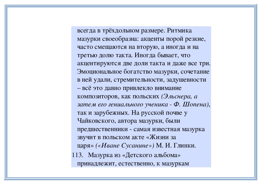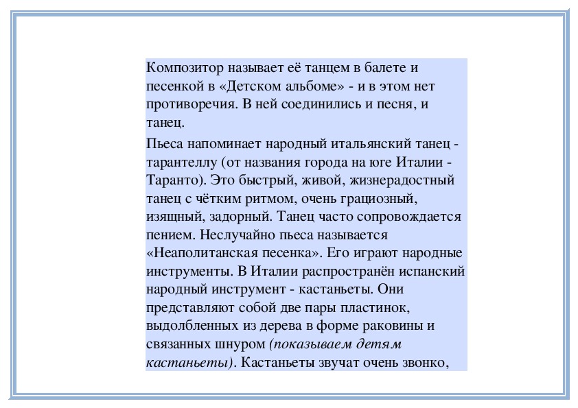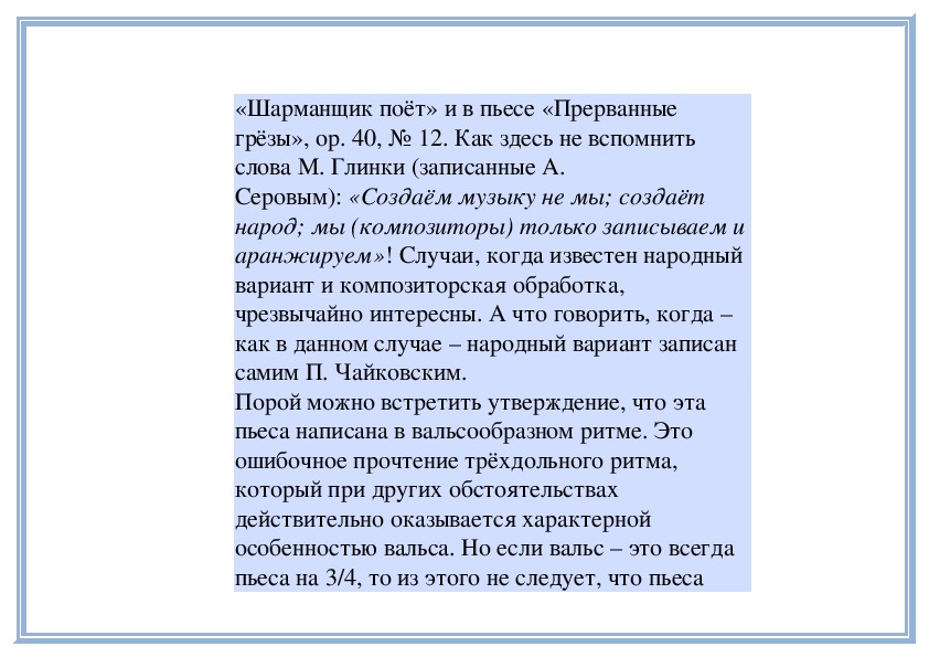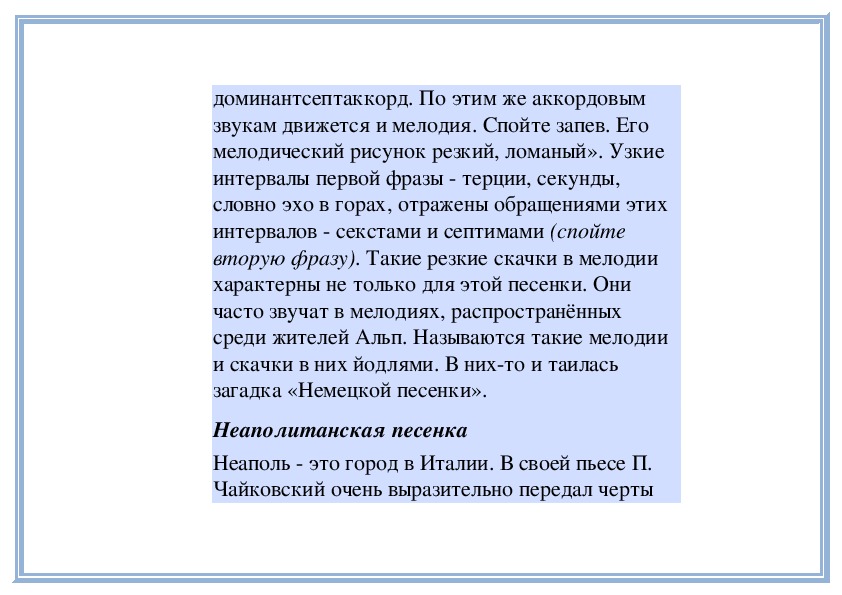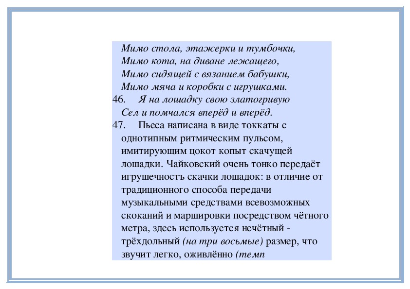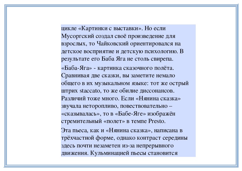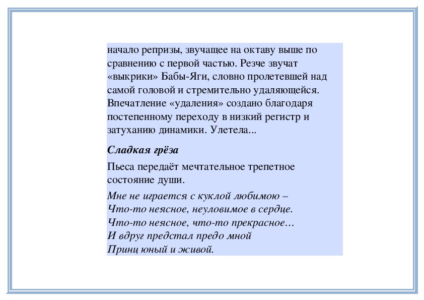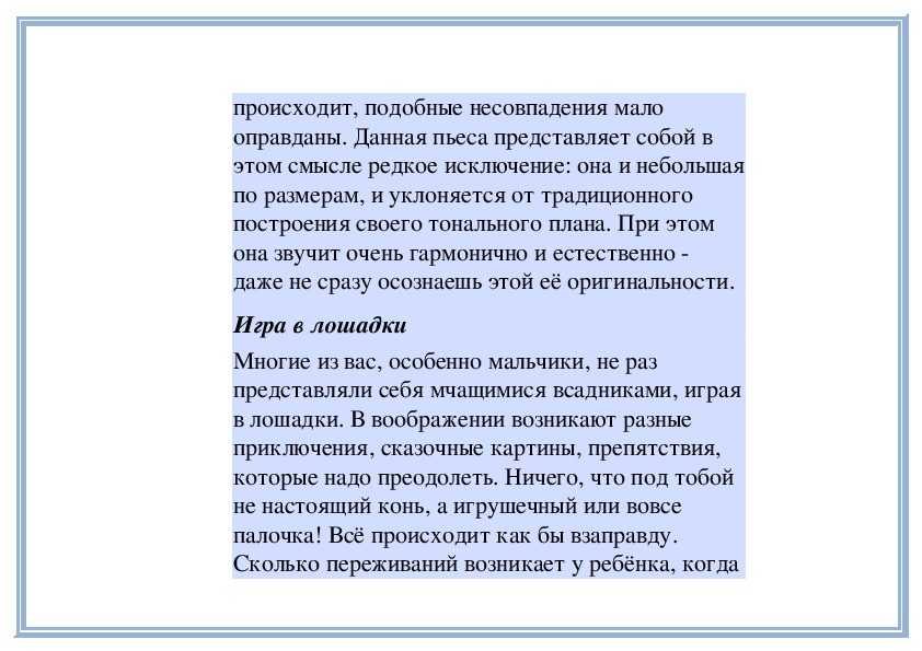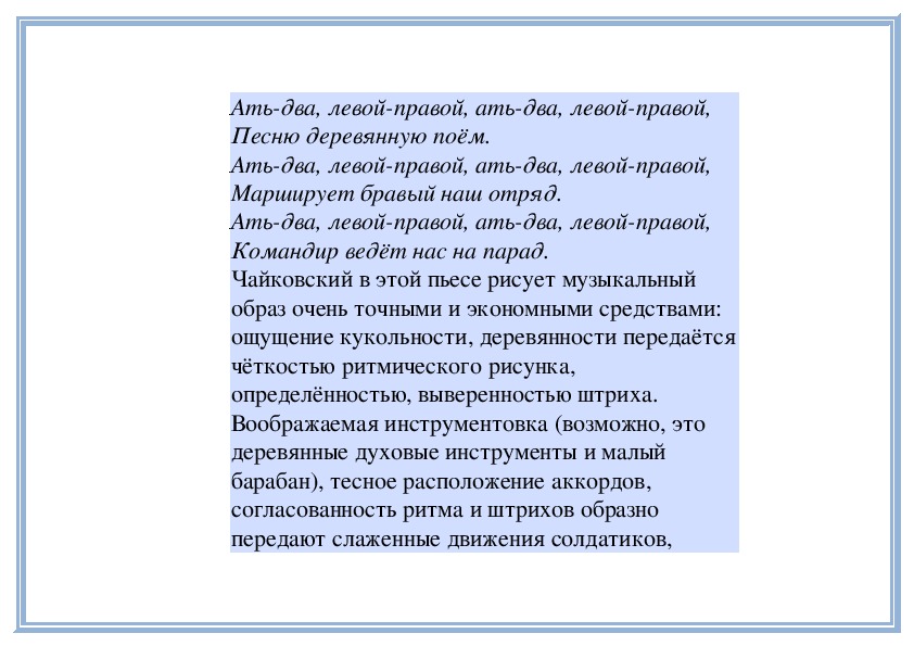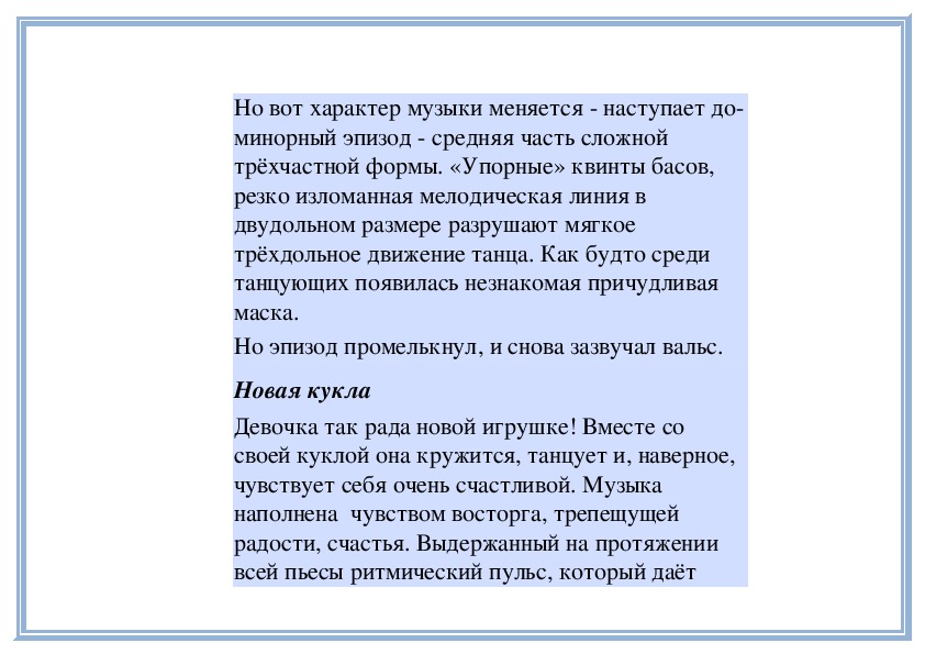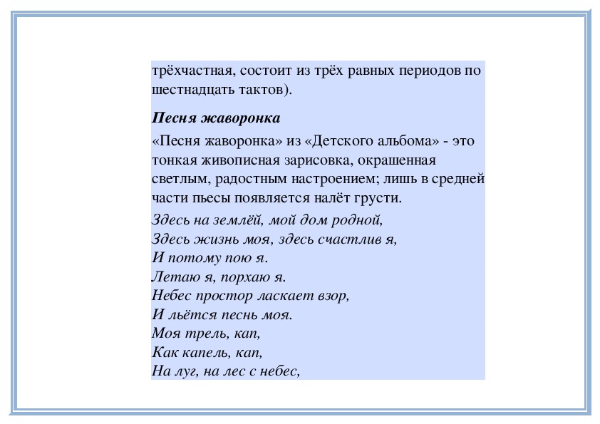 Музыка Петра Ильича Чайковского звучит на всех континентах и везде находит горячих поклонников. Музыкальный язык великого лирика настолько ярок, что узнаваем в любом его произведении, будь то сложная симфония или незатейливая детская пьеса. По-настоящему понять и оценить его крупные произведения вы сможете, когда станете взрослыми. Мы же обратимся к «Детскому альбому».