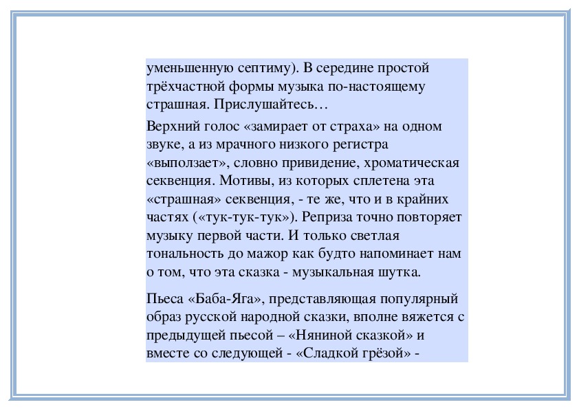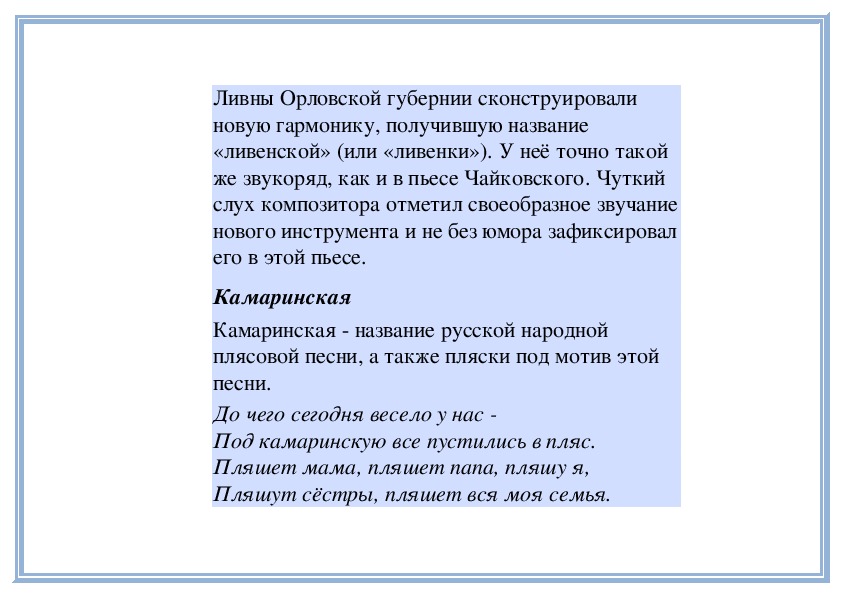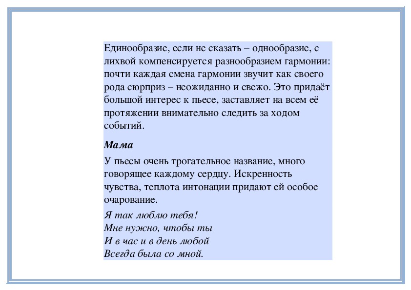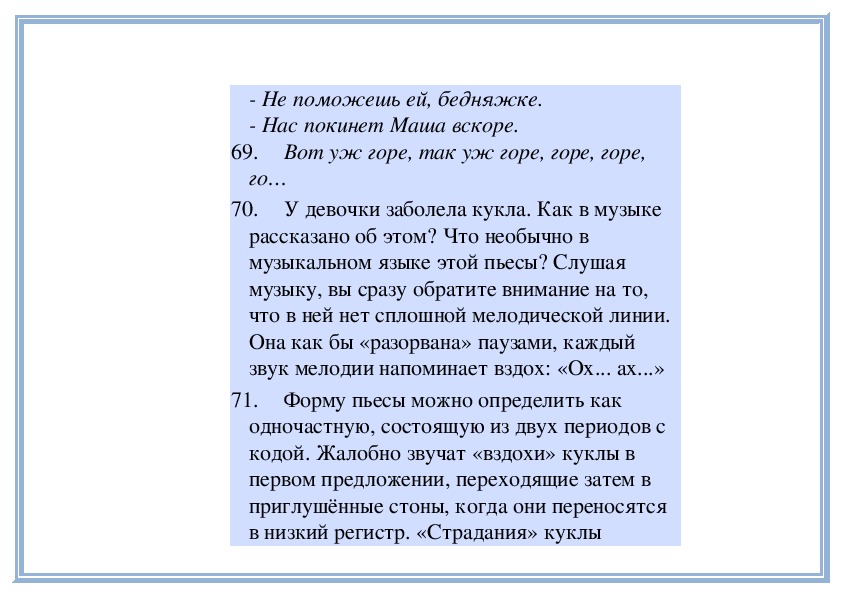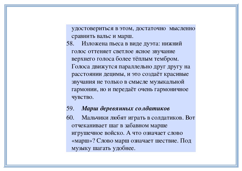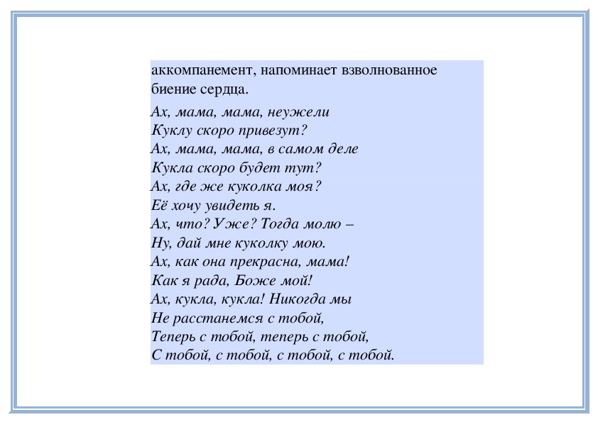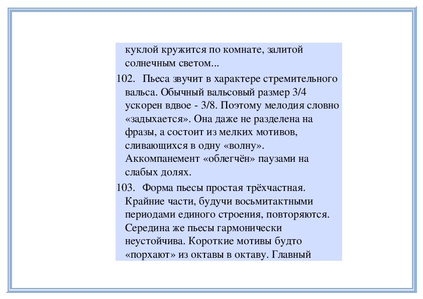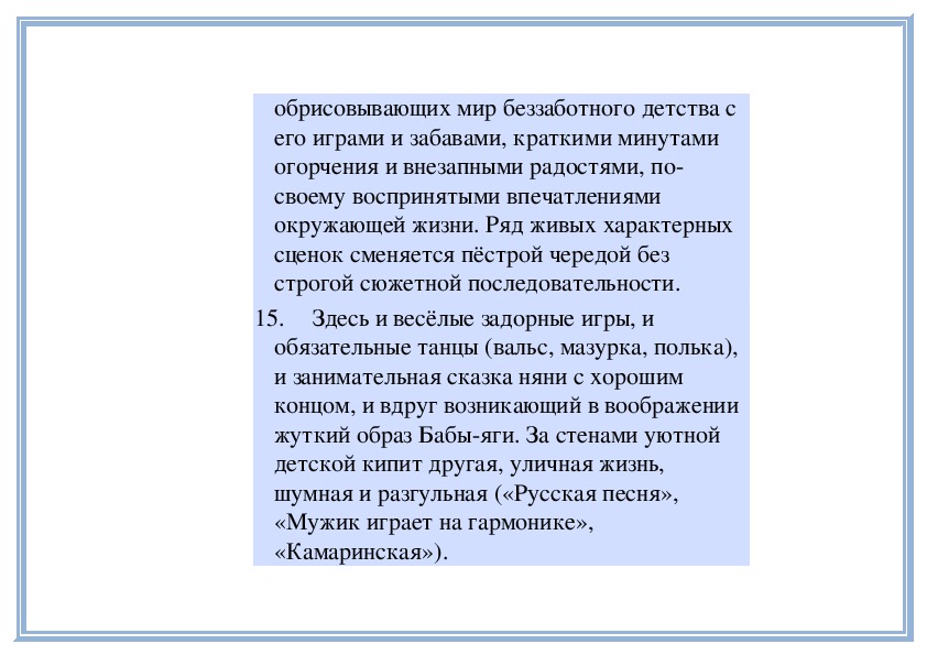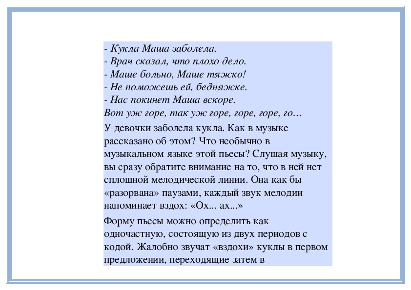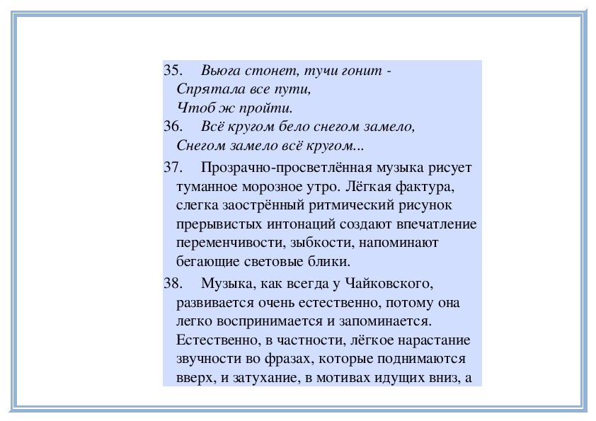 Музыка Петра Ильича Чайковского звучит на всех континентах и везде находит горячих поклонников. Музыкальный язык великого лирика настолько ярок, что узнаваем в любом его произведении, будь то сложная симфония или незатейливая детская пьеса. По-настоящему понять и оценить его крупные произведения вы сможете, когда станете взрослыми. Мы же обратимся к «Детскому альбому».
