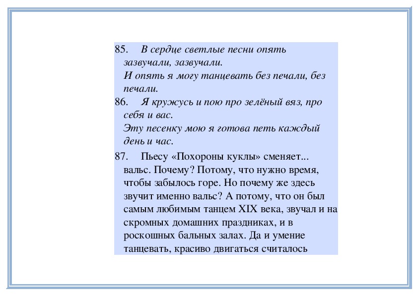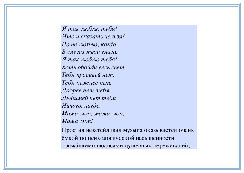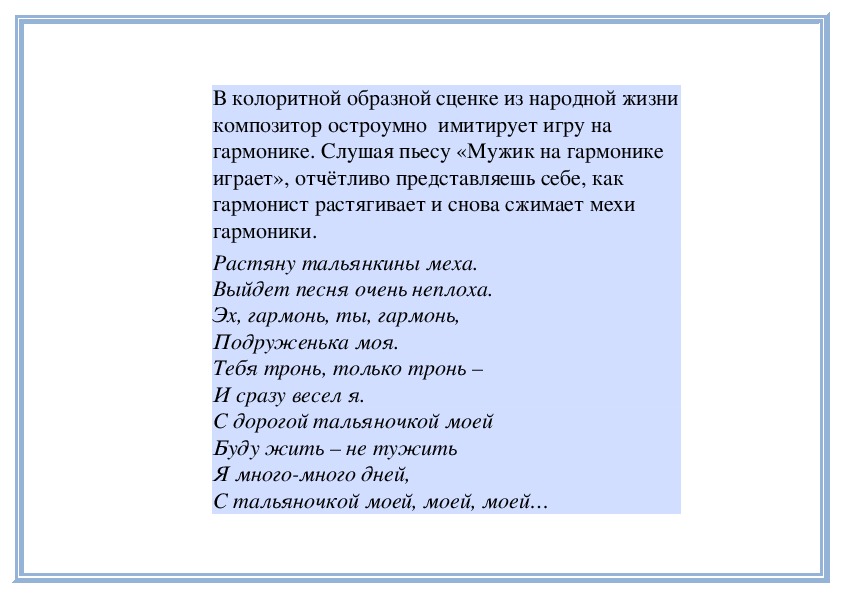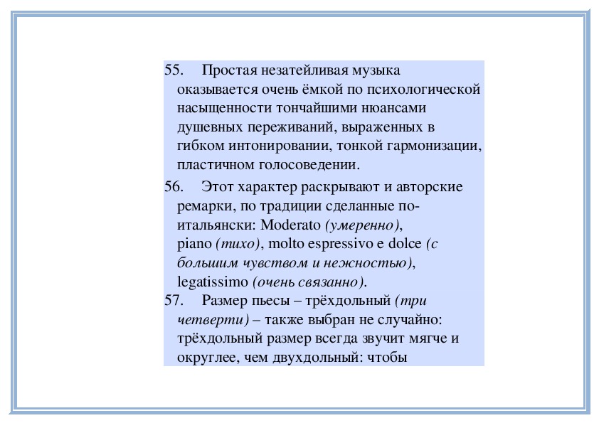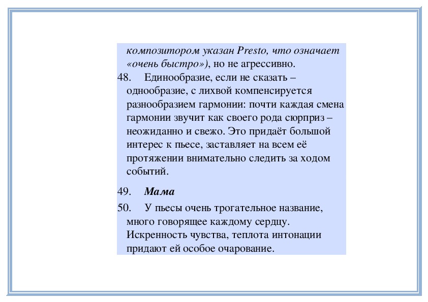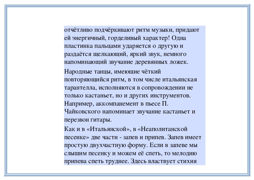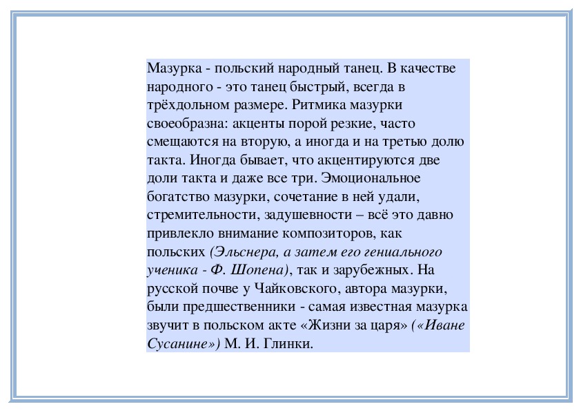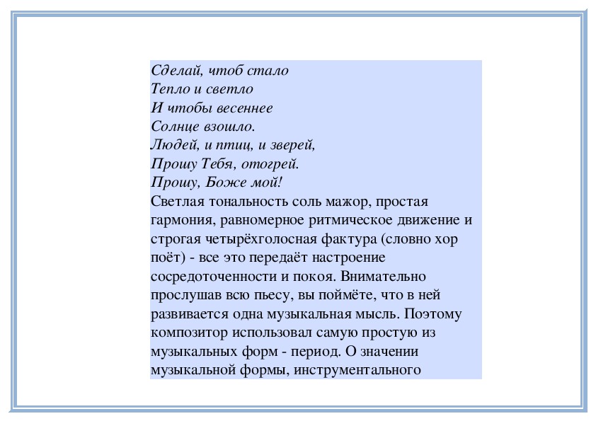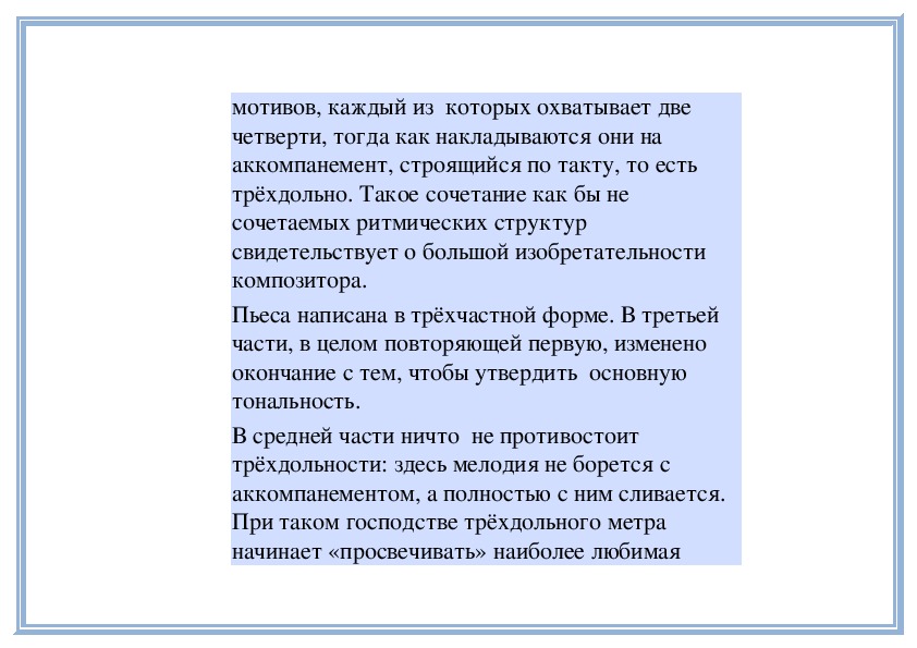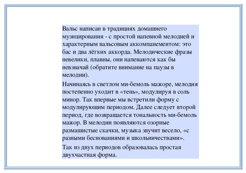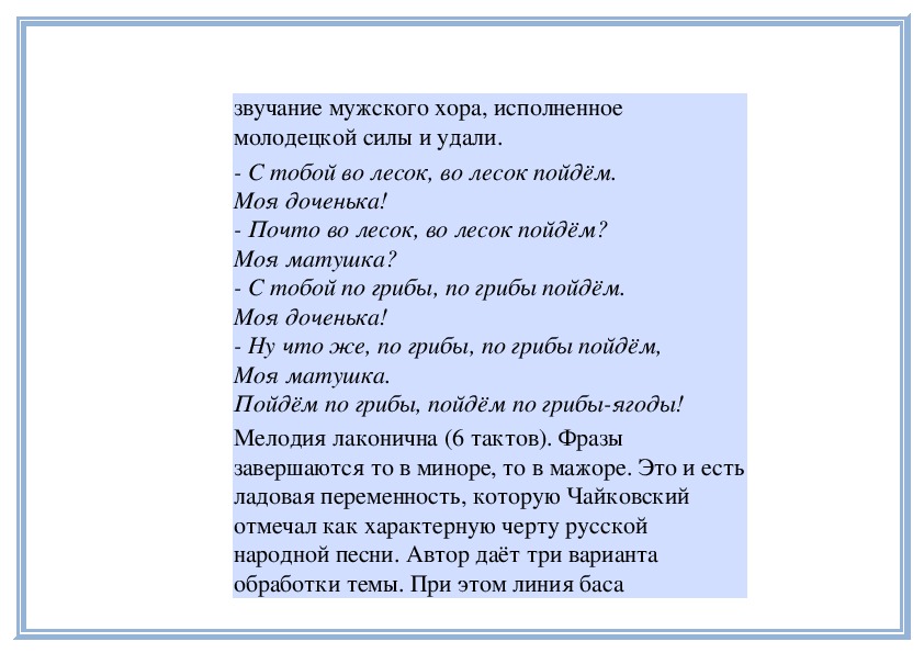 Музыка Петра Ильича Чайковского звучит на всех континентах и везде находит горячих поклонников. Музыкальный язык великого лирика настолько ярок, что узнаваем в любом его произведении, будь то сложная симфония или незатейливая детская пьеса. По-настоящему понять и оценить его крупные произведения вы сможете, когда станете взрослыми. Мы же обратимся к «Детскому альбому».