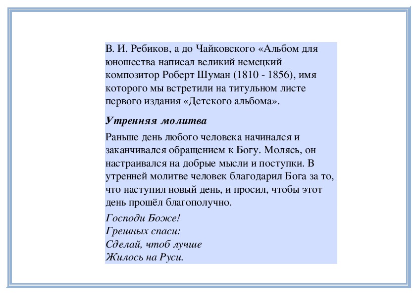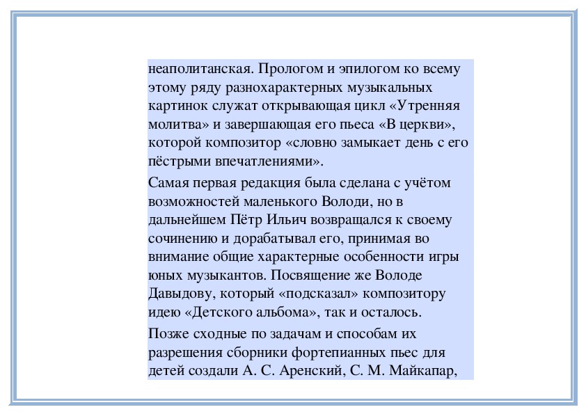 детей создали А. С. Аренский, С. М. Майкапар,В. И. Ребиков, а до Чайковского «Альбом для