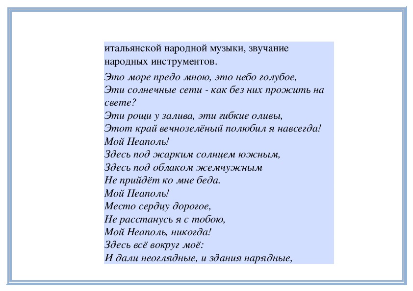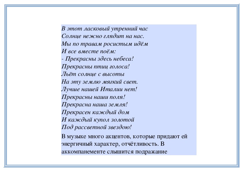 аккомпанементе слышится подражаниераспространённым в Италии музыкальным