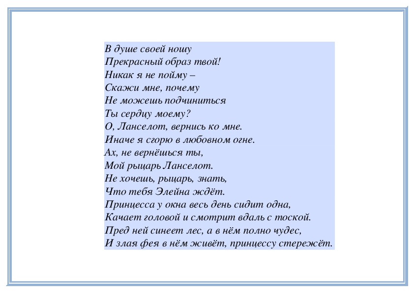 И злая фея в нём живёт, принцессу стережёт.«Где же ты, рыцарь на белом коне,