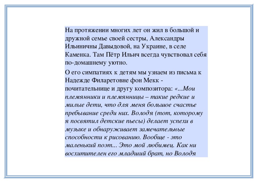 Чайковский был первым русским композитором, создавшим для детей альбом фортепианных пьес. Ему было легко это сделать, потому что он понимал и любил детей.