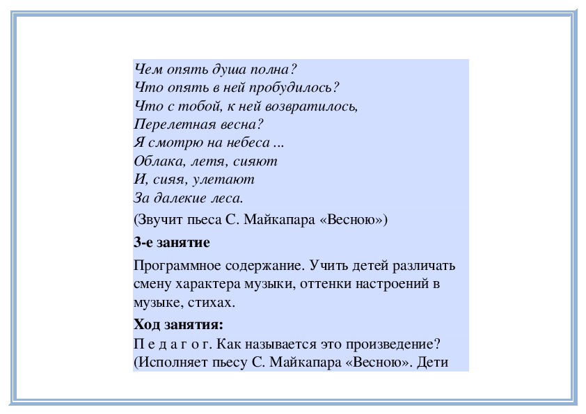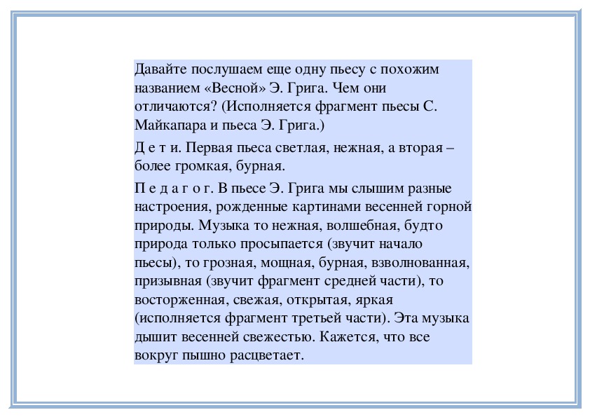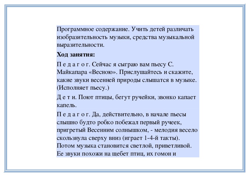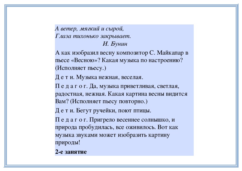 (Исполняет пьесу С. Майкапара «Весною». Детиназывают пьесу, говорят о характере музыки.)