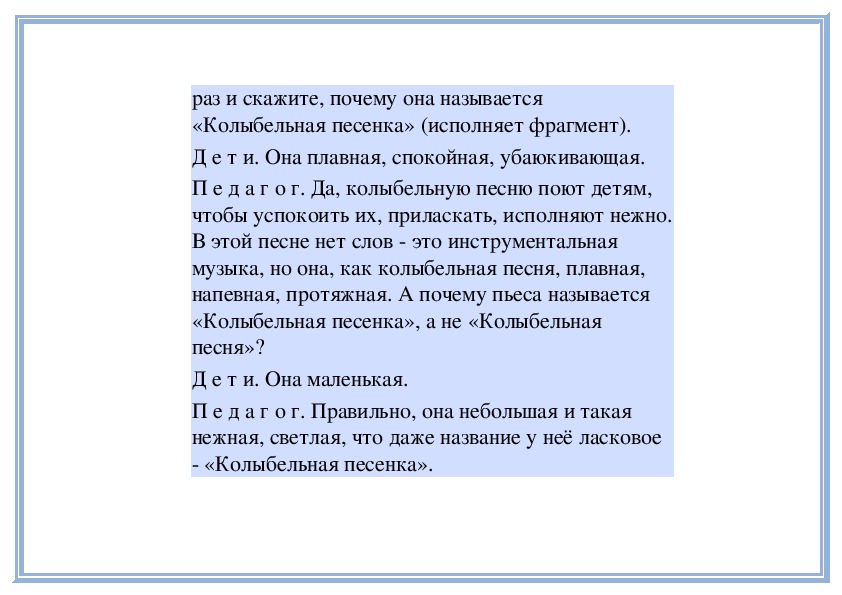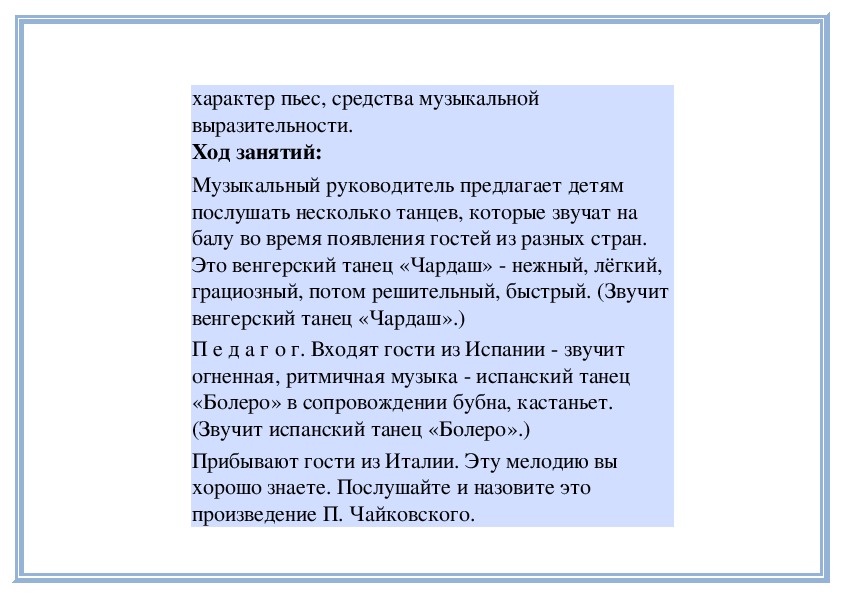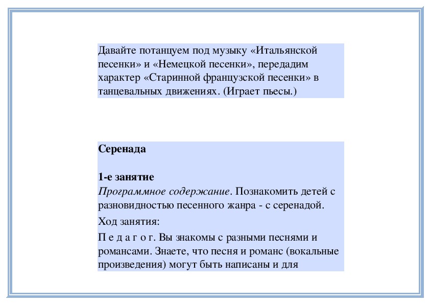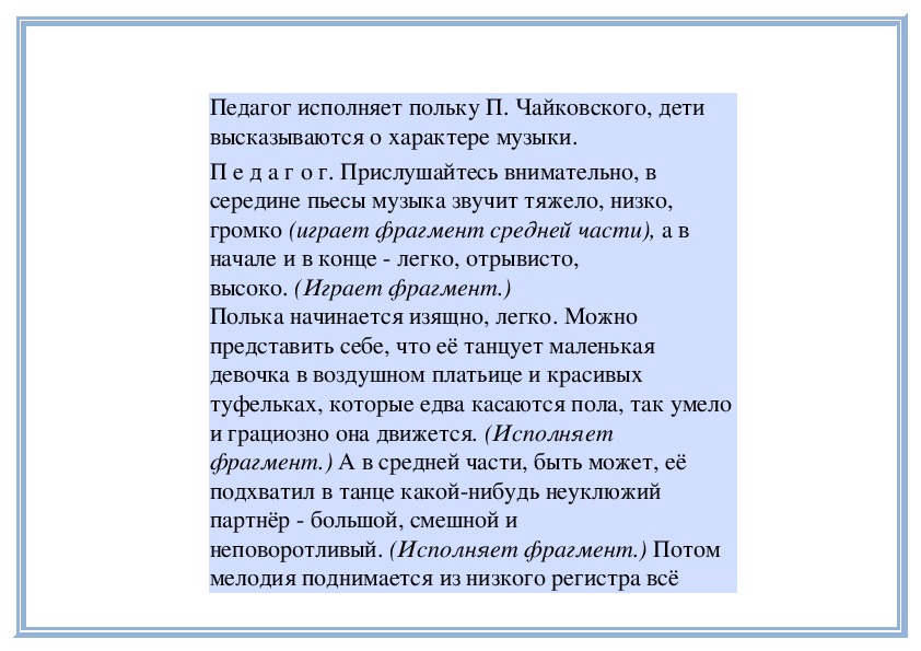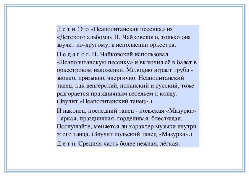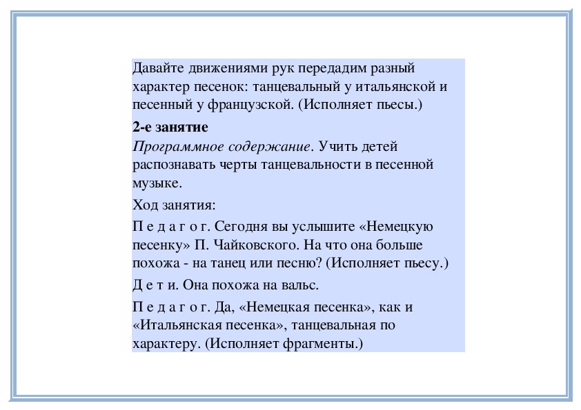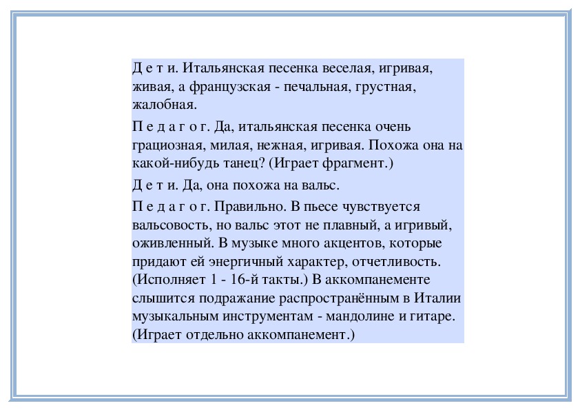 П е д а г о г. В «Детском альбоме» П. Чайковского кроме «Русской песни» есть народные песни других стран - «Итальянская песенка», «Старинная французская песенка», «Немецкая песенка». В каждой пьесе отражаются особенности народной музыки этих стран. Давайте сравним итальянскую и старинную французскую песенки. Чем они отличаются? (Исполняет обе пьесы.)