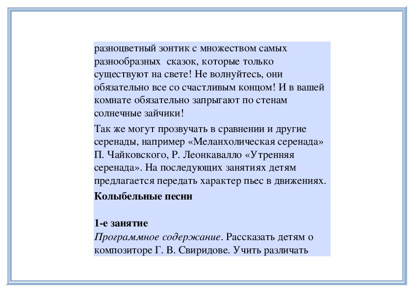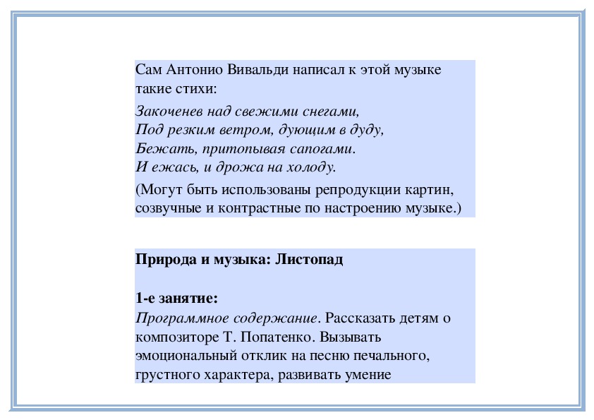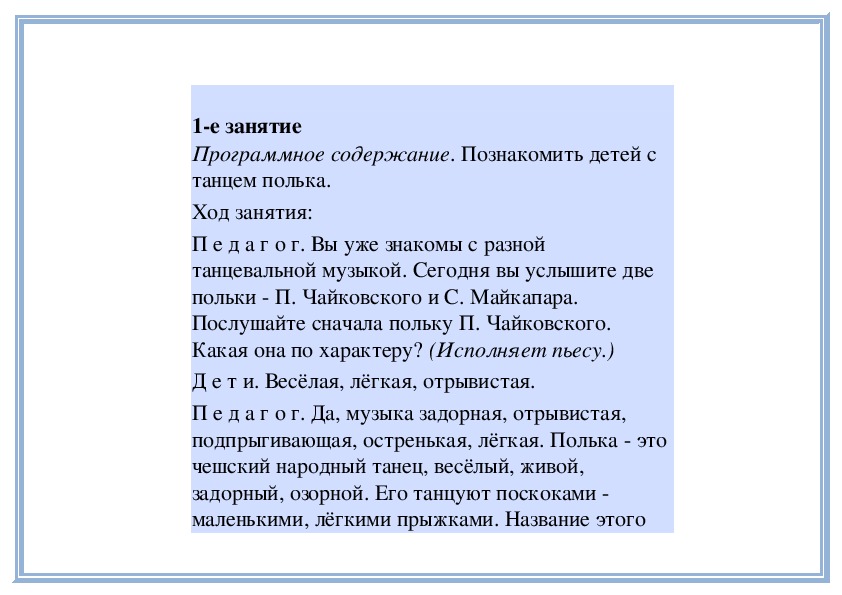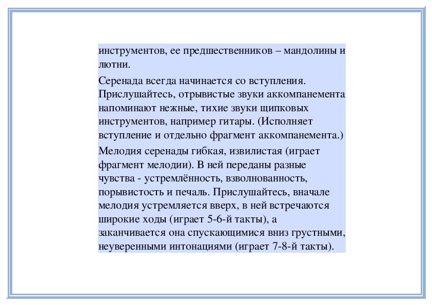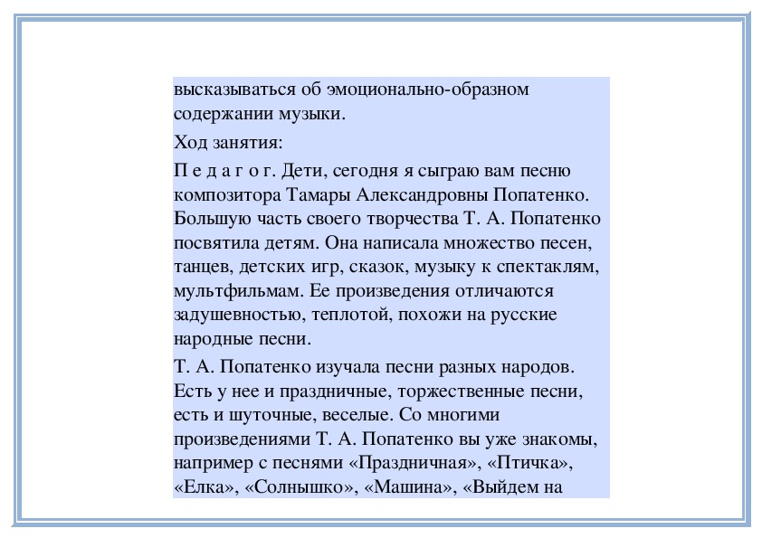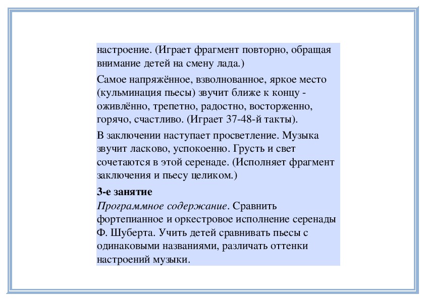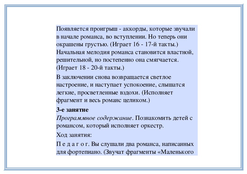 П е д а г о г. В «Детском альбоме» П. Чайковского кроме «Русской песни» есть народные песни других стран - «Итальянская песенка», «Старинная французская песенка», «Немецкая песенка». В каждой пьесе отражаются особенности народной музыки этих стран. Давайте сравним итальянскую и старинную французскую песенки. Чем они отличаются? (Исполняет обе пьесы.)