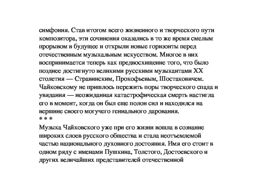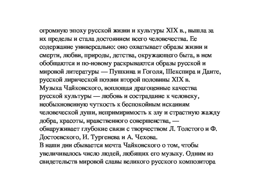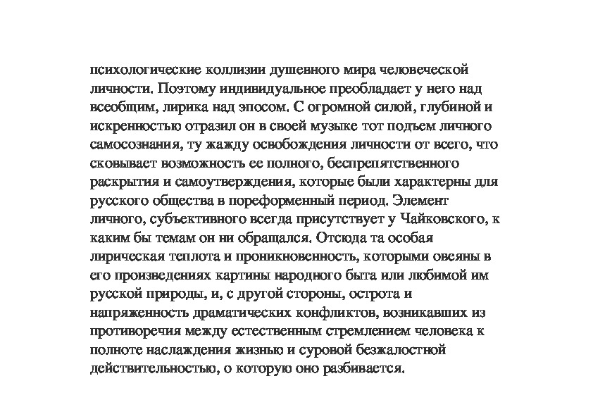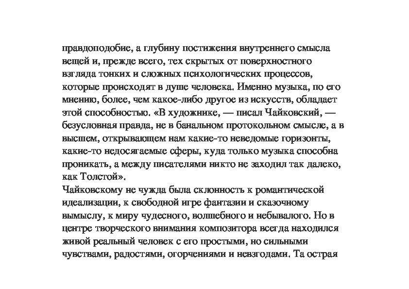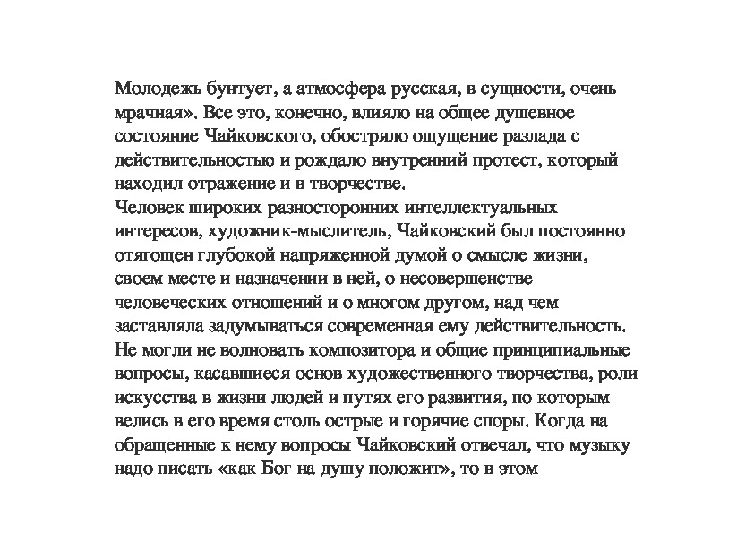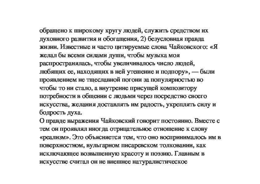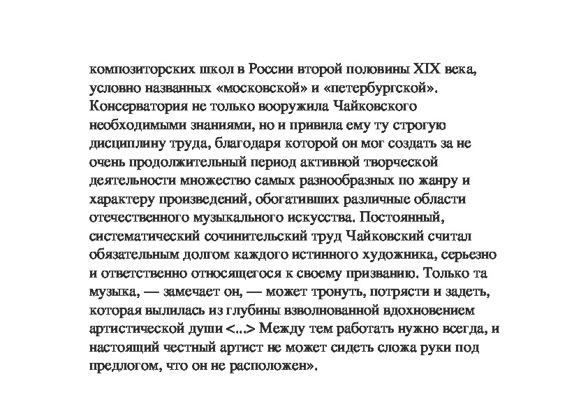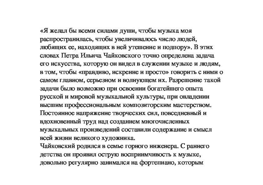 «Я желал бы всеми силами души, чтобы музыка моя распространилась, чтобы увеличивалось число людей, любящих ее, находящих в ней утешение и подпору». В этих словах Петра Ильича Чайковского точно определена задача его искусства, которую он видел в служении музыке и людям, в том, чтобы «правдиво, искренне и просто» говорить с ними о самом главном, серьезном и волнующем их. Разрешение такой задачи было возможно при освоении богатейшего опыта русской и мировой музыкальной культуры, при овладении высшим профессиональным композиторским мастерством. Постоянное напряжение творческих сил, повседневный и вдохновенный труд над созданием многочисленных музыкальных произведений составили содержание и смысл всей жизни великого художника.
