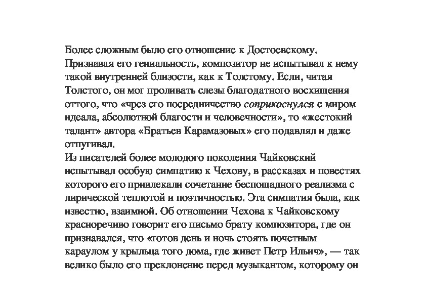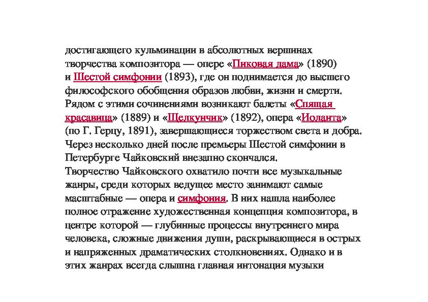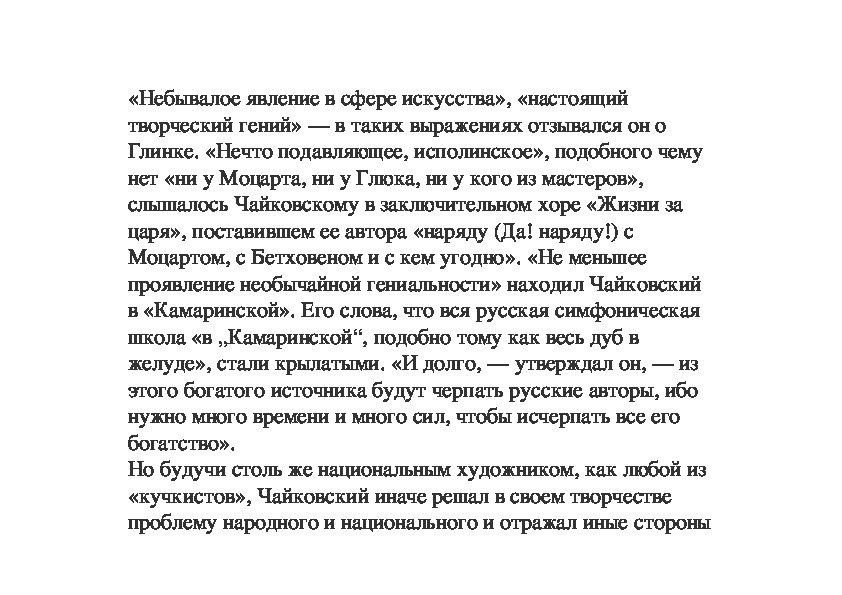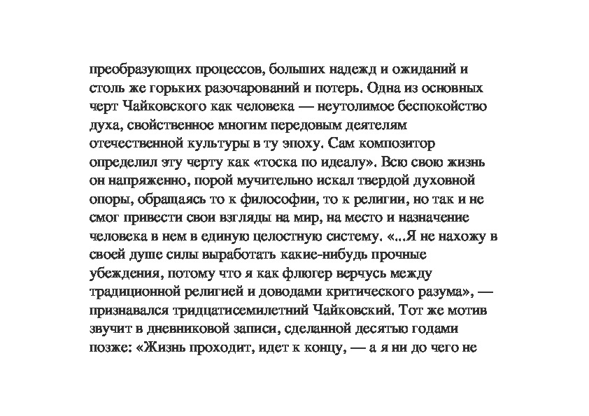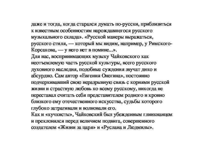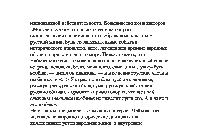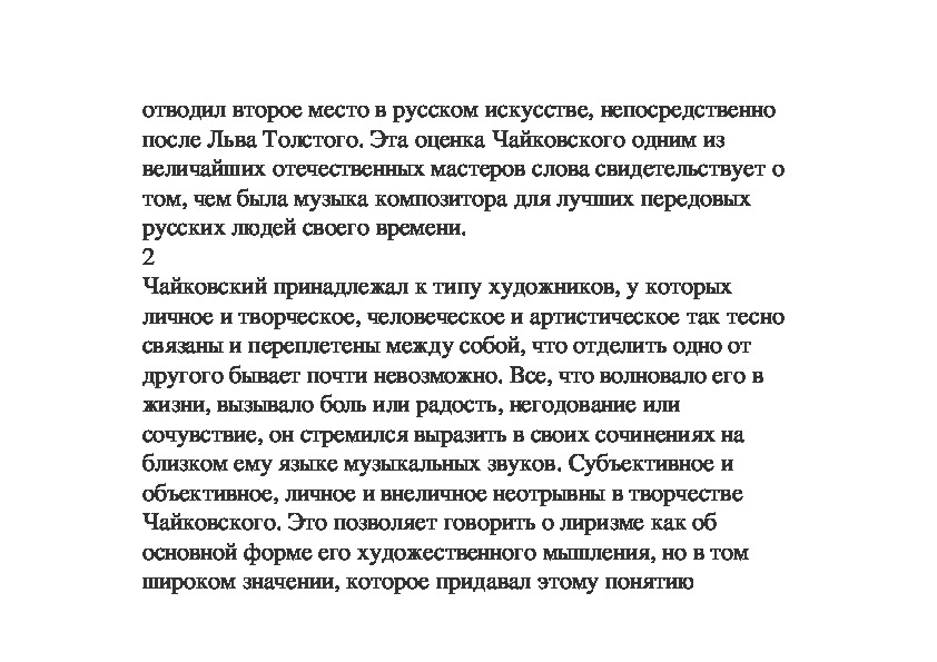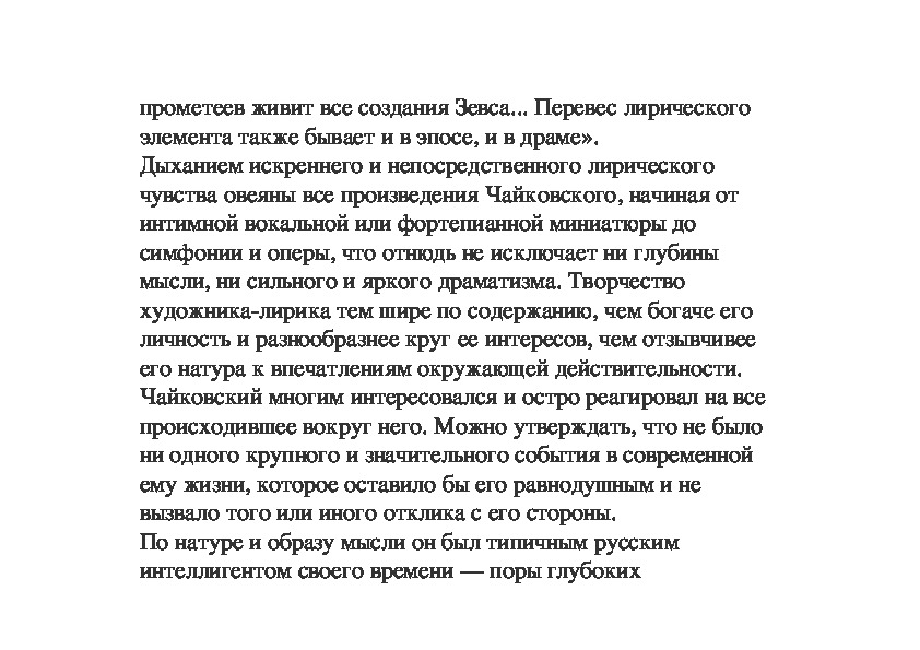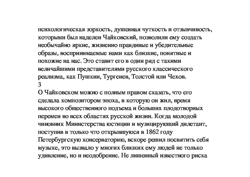 «Я желал бы всеми силами души, чтобы музыка моя распространилась, чтобы увеличивалось число людей, любящих ее, находящих в ней утешение и подпору». В этих словах Петра Ильича Чайковского точно определена задача его искусства, которую он видел в служении музыке и людям, в том, чтобы «правдиво, искренне и просто» говорить с ними о самом главном, серьезном и волнующем их. Разрешение такой задачи было возможно при освоении богатейшего опыта русской и мировой музыкальной культуры, при овладении высшим профессиональным композиторским мастерством. Постоянное напряжение творческих сил, повседневный и вдохновенный труд над созданием многочисленных музыкальных произведений составили содержание и смысл всей жизни великого художника.