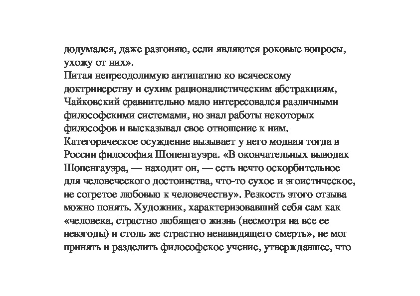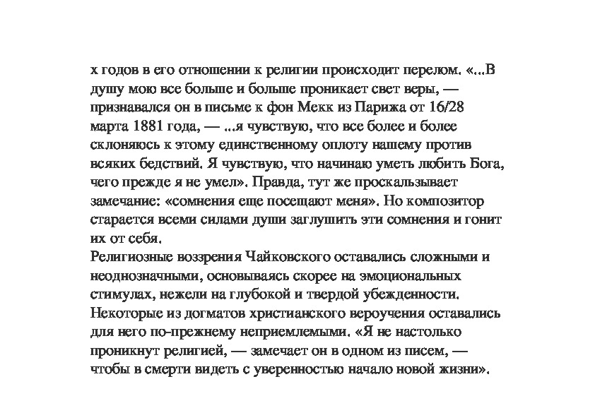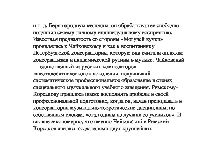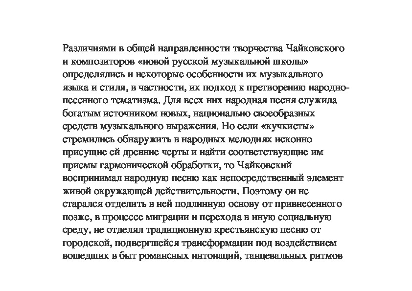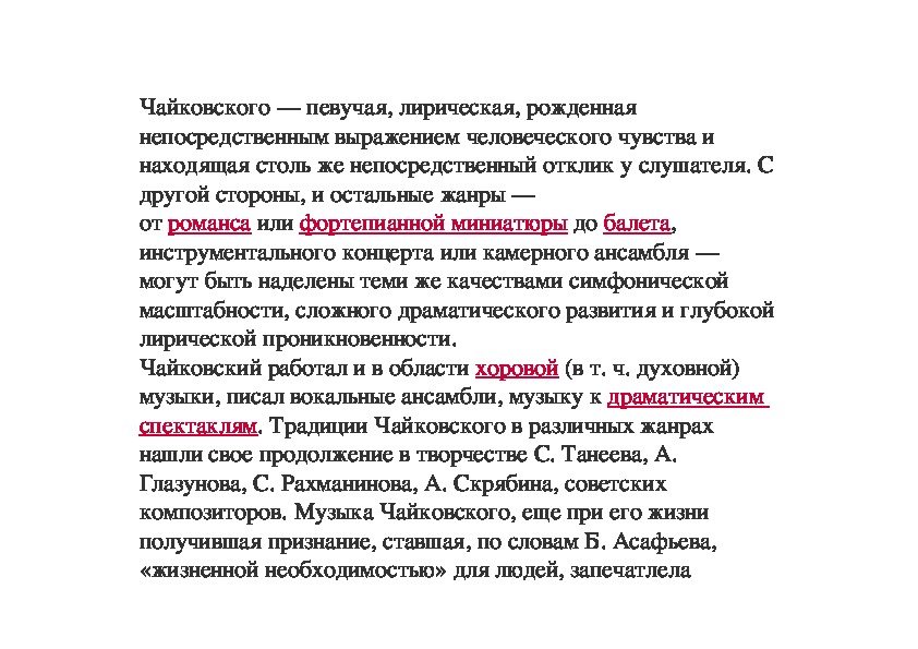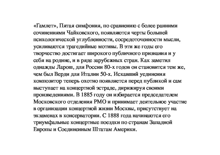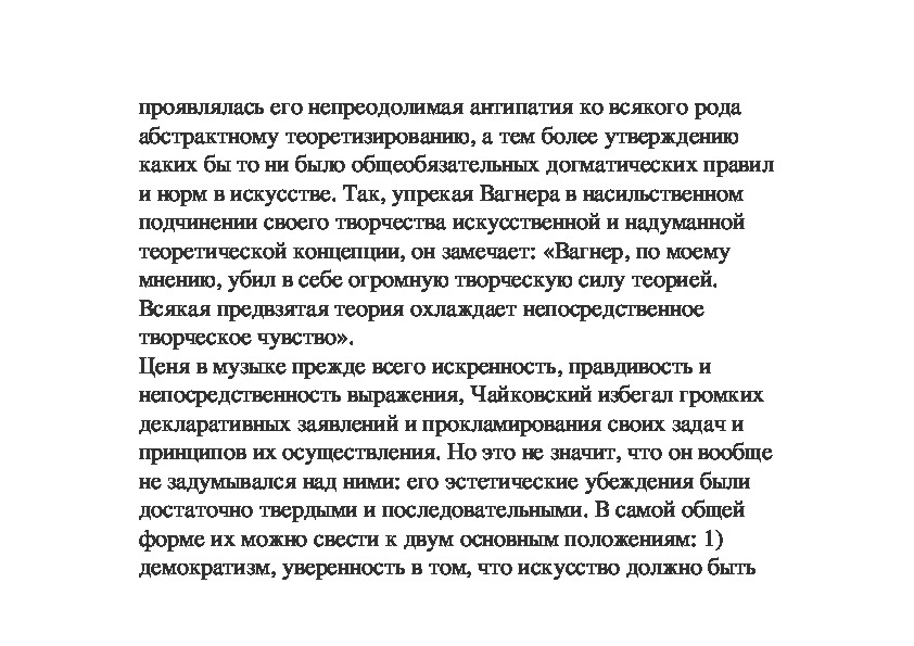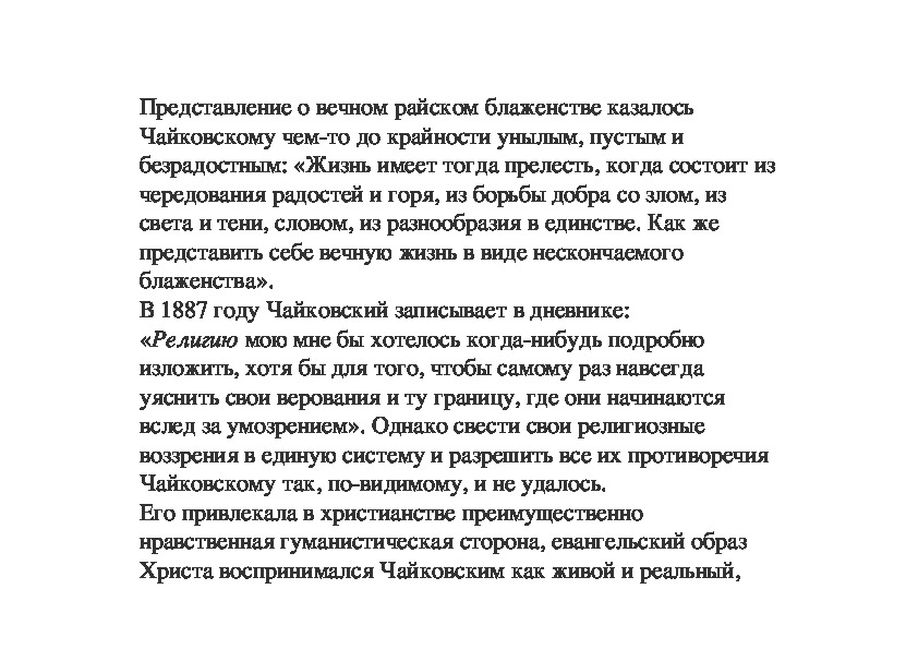 «Я желал бы всеми силами души, чтобы музыка моя распространилась, чтобы увеличивалось число людей, любящих ее, находящих в ней утешение и подпору». В этих словах Петра Ильича Чайковского точно определена задача его искусства, которую он видел в служении музыке и людям, в том, чтобы «правдиво, искренне и просто» говорить с ними о самом главном, серьезном и волнующем их. Разрешение такой задачи было возможно при освоении богатейшего опыта русской и мировой музыкальной культуры, при овладении высшим профессиональным композиторским мастерством. Постоянное напряжение творческих сил, повседневный и вдохновенный труд над созданием многочисленных музыкальных произведений составили содержание и смысл всей жизни великого художника.