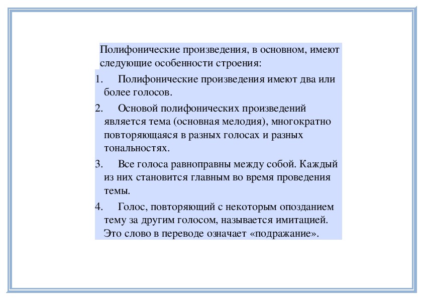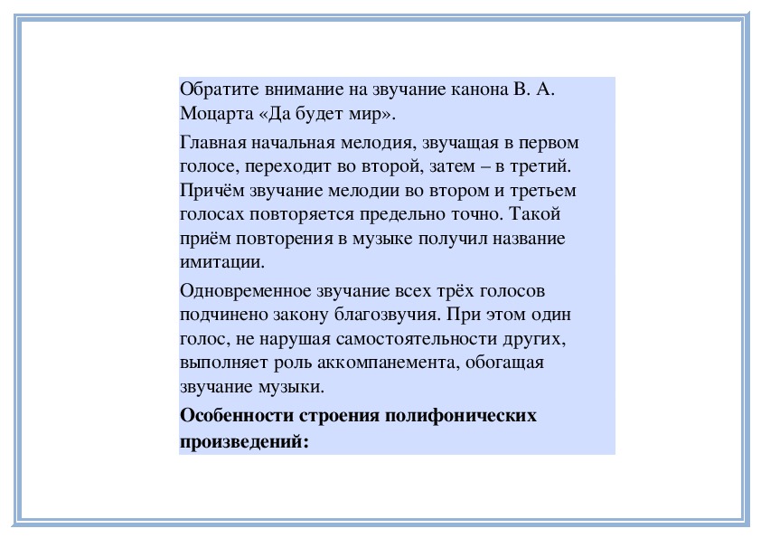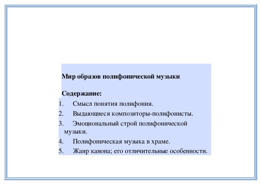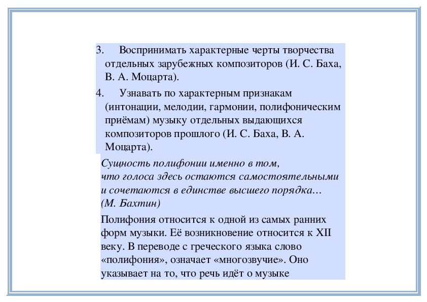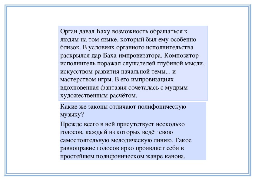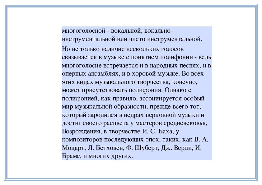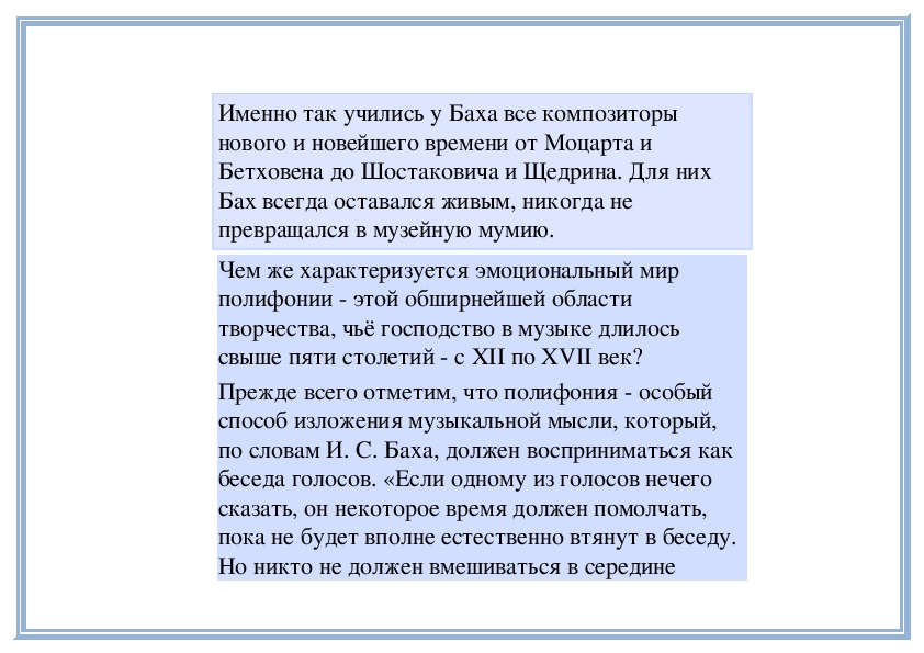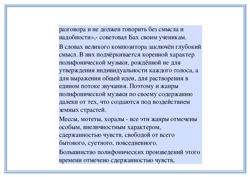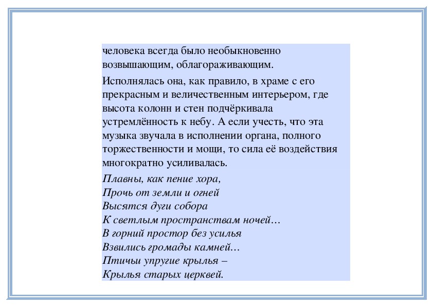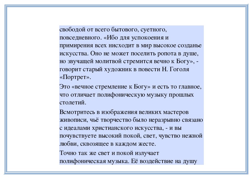 Точно так же свет и покой излучает полифоническая музыка. Её воздействие на душу человека всегда было необыкновенно возвышающим, облагораживающим.