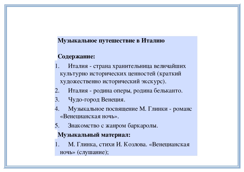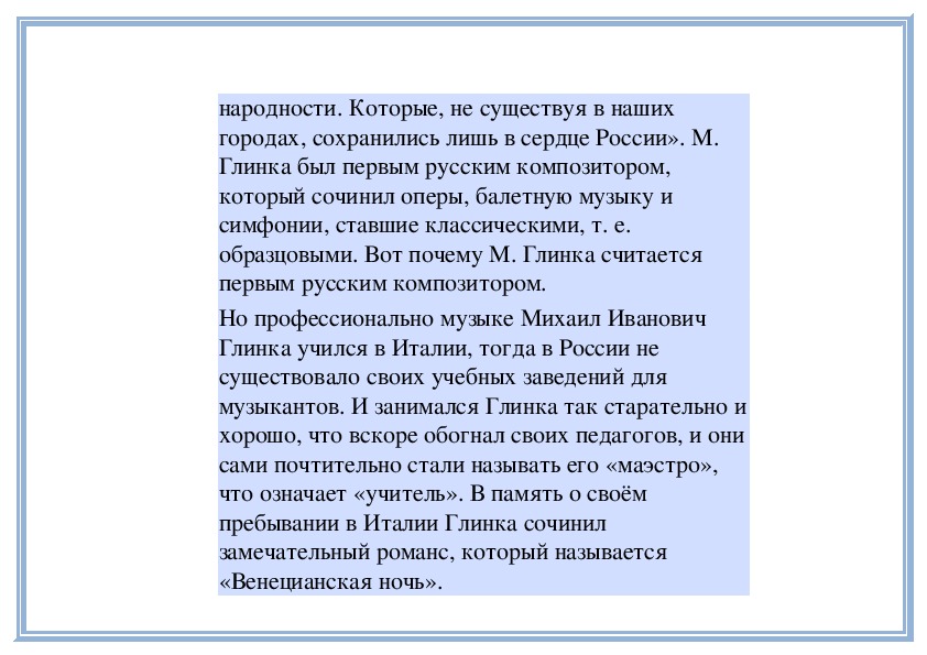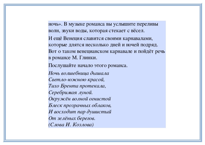 Слушание: М. Глинка. Романс «Венецианская