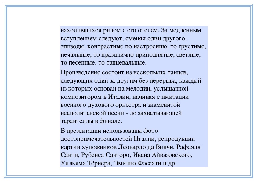 мечтательный романс М. Глинки «Венецианскаяночь». В музыке романса вы услышите переливы