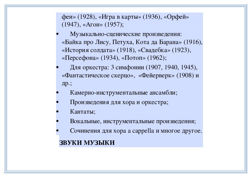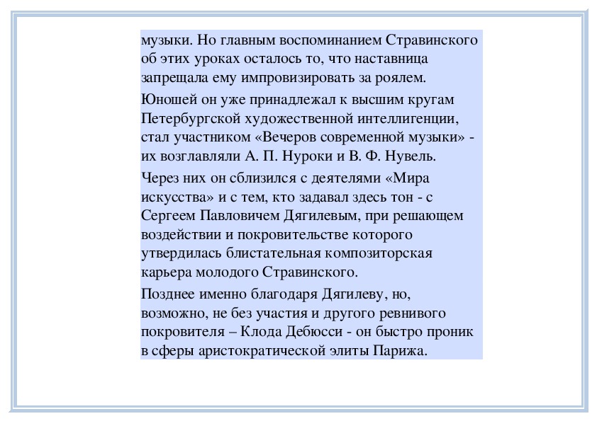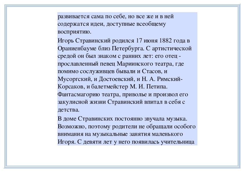 Игоря. С девяти лет у него появилась учительницамузыки. Но главным воспоминанием Стравинского