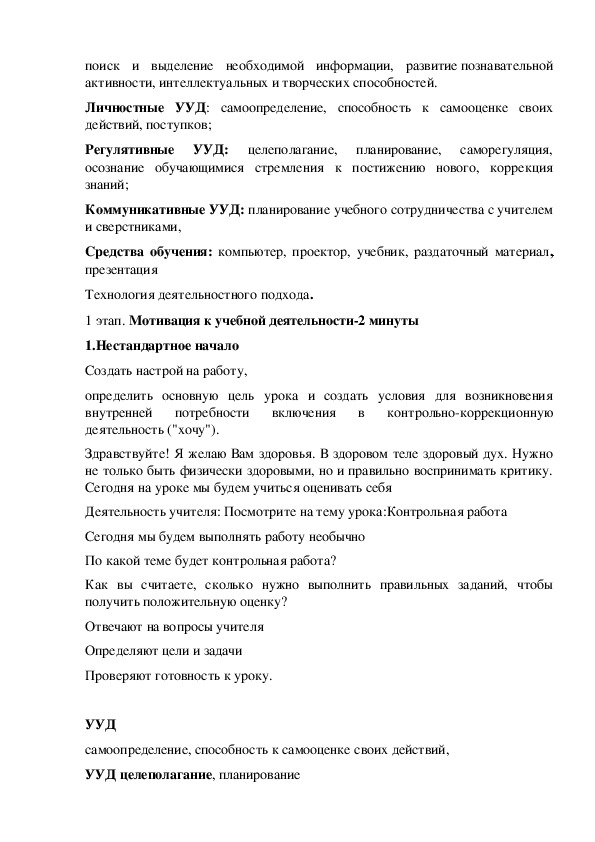 контрольной работы на применение способов действий, запланированных для