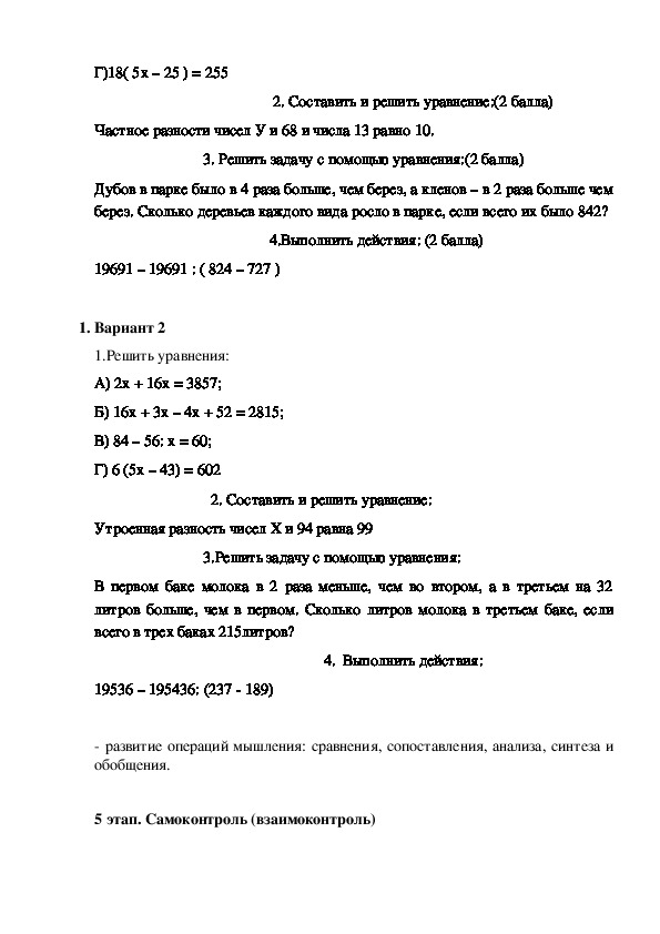 Урок развивающего контроля по теме «Решение уравнений»
