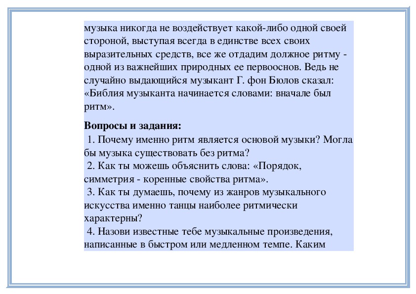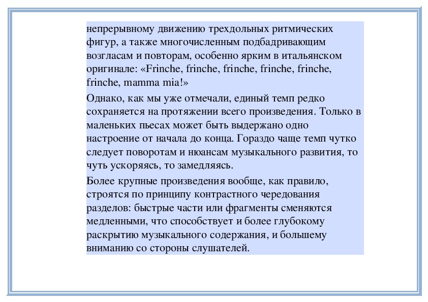 Музыка созерцательного, углубленного характера редко имеет быстрый темп, музыка же веселого или шуточного характера, наоборот, почти никогда не бывает медленной. Вот почему, даже не зная многих музыкальных произведений, мы можем заранее угадать их темп по тому, что известно об их содержании или жанре.