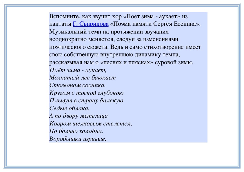 вниманию со стороны слушателей.Вспомните, как звучит хор «Поет зима аукает» из