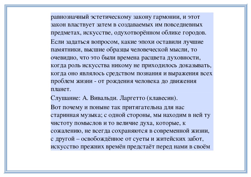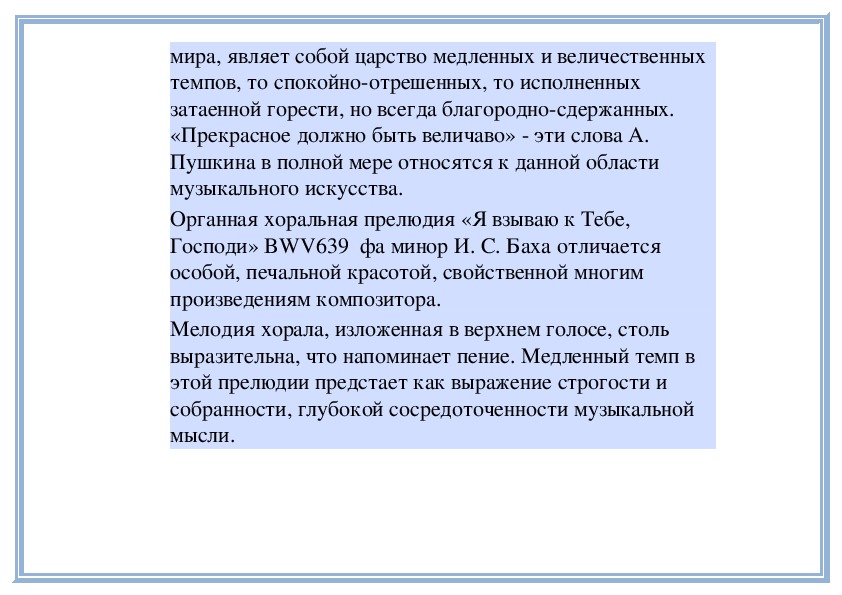 Прежде всего, вспомним, что орган был первоначально церковным инструментом и с его звучанием связывались самые светлые и возвышенные образы. Точно так же и хорал возник как церковное песнопение, и лишь со временем некоторые композиторы стали включать мелодии хоралов в свои инструментальные сочинения. Духовная музыка, просветленная, свободная от суеты мира, являет собой царство медленных и величественных темпов, то спокойно-отрешенных, то исполненных затаенной горести, но всегда благородно-сдержанных. «Прекрасное должно быть величаво» - эти слова А. Пушкина в полной мере относятся к данной области музыкального искусства.