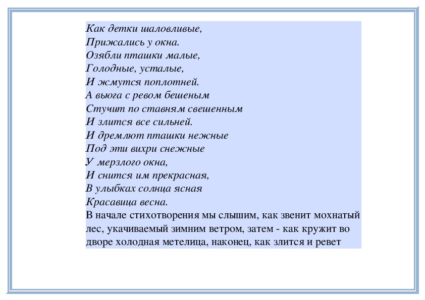 дворе холодная метелица, наконец, как злится и реветвьюга, стуча по ставням. Усилению злого зимнего образа