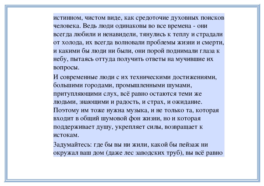 Духовная музыка, просветленная, свободная от суетымира, являет собой царство медленных и величественных