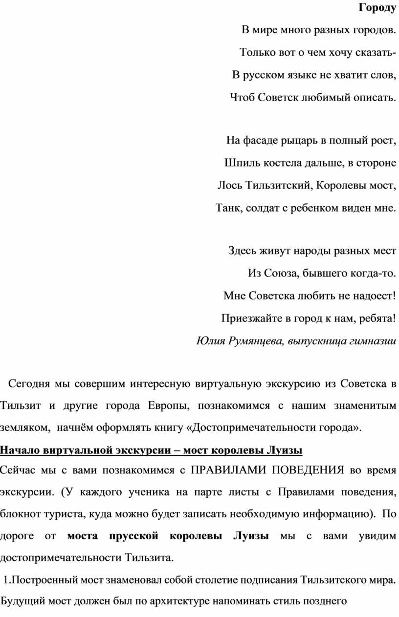 Сейчас мы с вами познакомимся с ПРАВИЛАМИ ПОВЕДЕНИЯ во время экскурсии. (У каждого ученика на парте листы с Правилами поведения, блокнот туриста, куда можно будет записать необходимую информацию). По дороге от моста прусской королевы Луизы мы с вами увидим достопримечательности Тильзита.