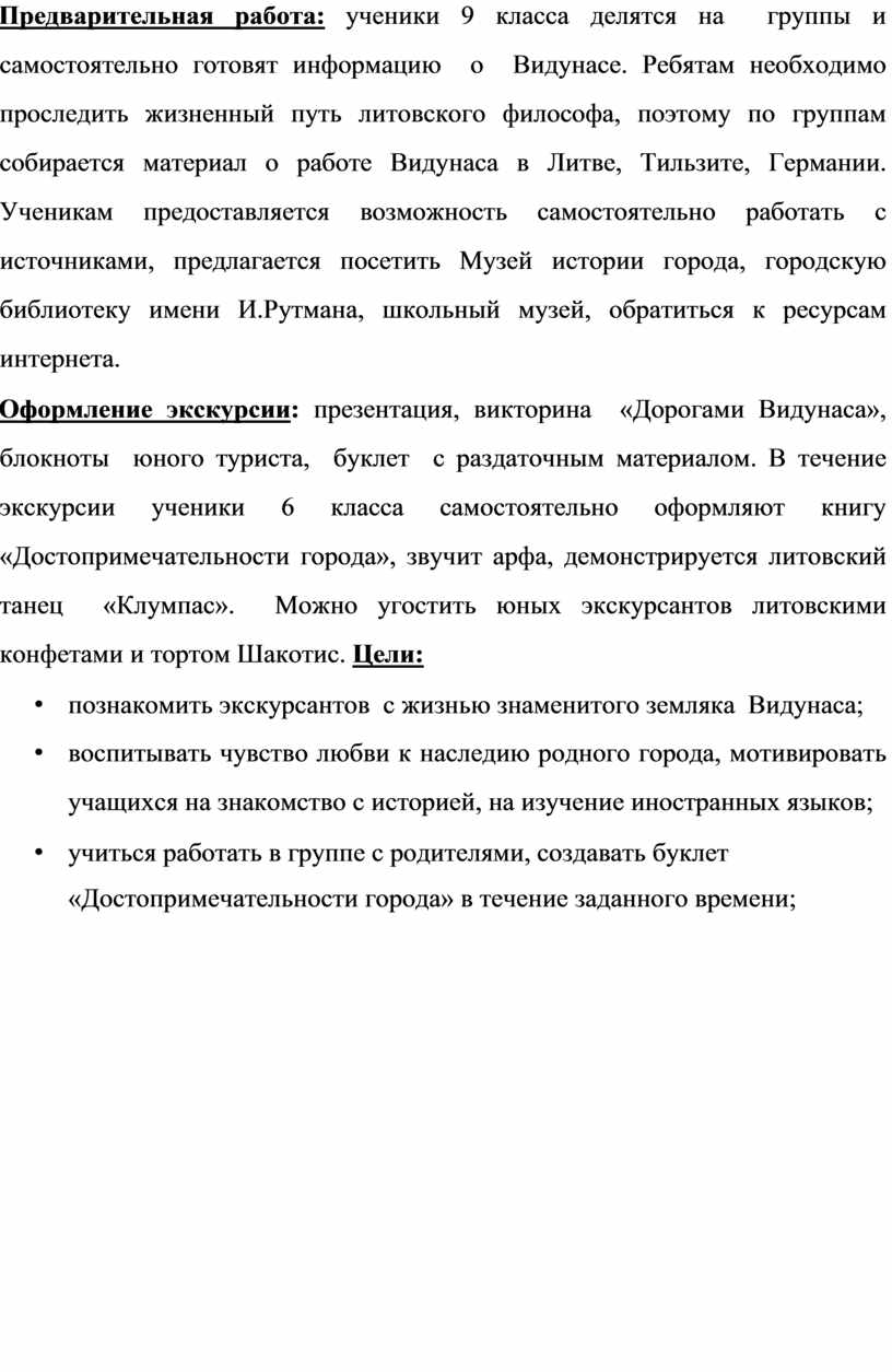Оформление экскурсии: презентация, викторина «Дорогами Видунаса», блокноты юного туриста, буклет с раздаточным материалом. В течение экскурсии ученики 6 класса самостоятельно оформляют книгу «Достопримечательности города», звучит арфа, демонстрируется литовский танец «Клумпас». Можно угостить юных экскурсантов литовскими конфетами и тортом Шакотис. Цели: