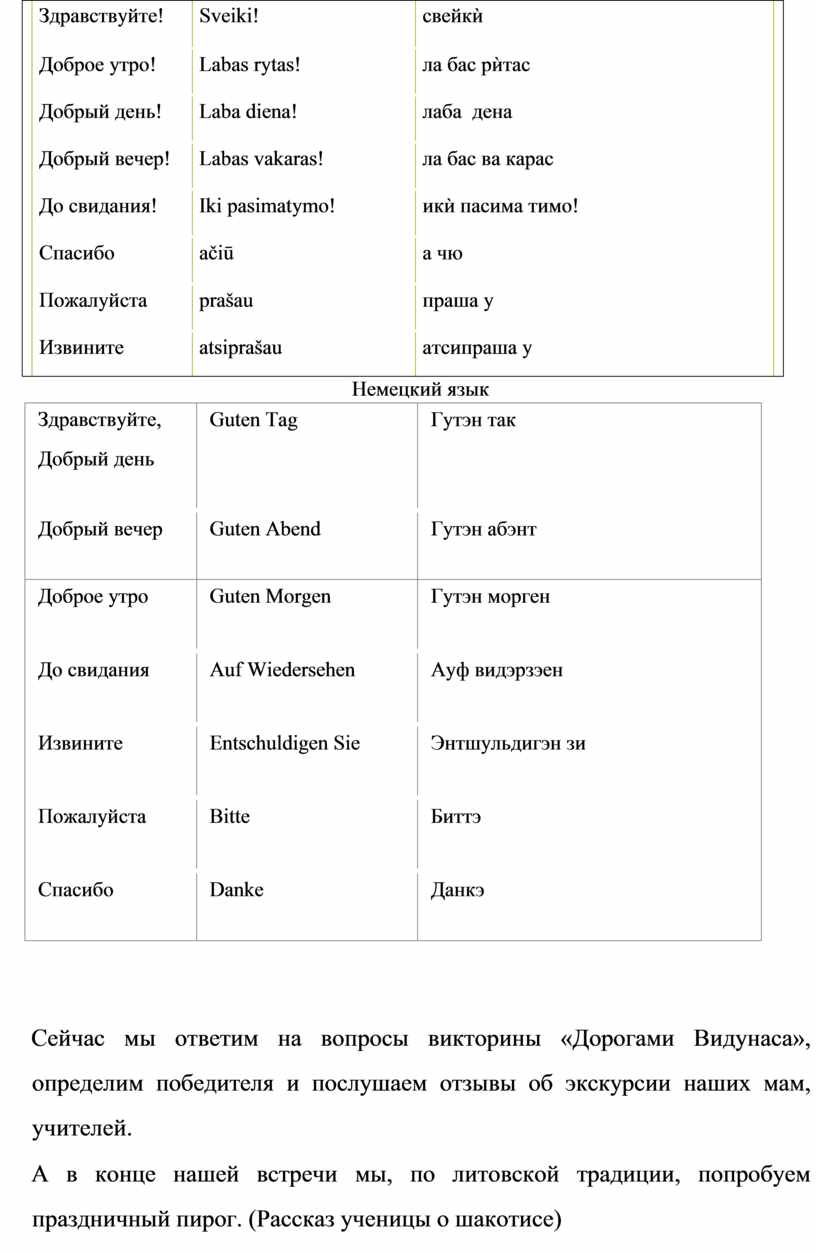 Вы понимаете, что язык – это средство общения. Давайте с вами воспользуемся словарем вежливого туриста и узнаем, как звучат понемецки и по-литовски слова приветствия, прощания: