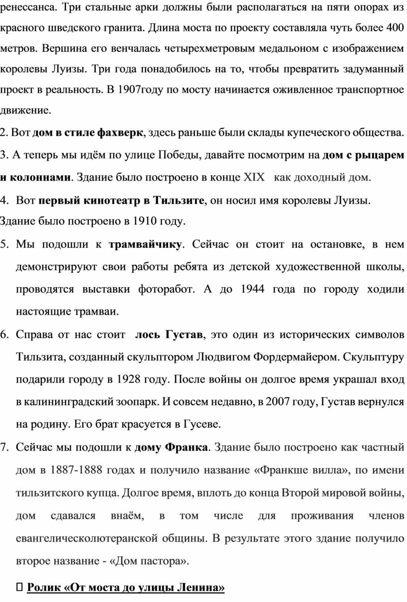 1.Построенный мост знаменовал собой столетие подписания Тильзитского мира. Будущий мост должен был по архитектуре напоминать стиль позднего ренессанса. Три стальные арки должны были располагаться на пяти опорах из красного шведского гранита. Длина моста по проекту составляла чуть более 400 метров. Вершина его венчалась четырехметровым медальоном с изображением королевы Луизы. Три года понадобилось на то, чтобы превратить задуманный проект в реальность. В 1907году по мосту начинается оживленное транспортное движение.
