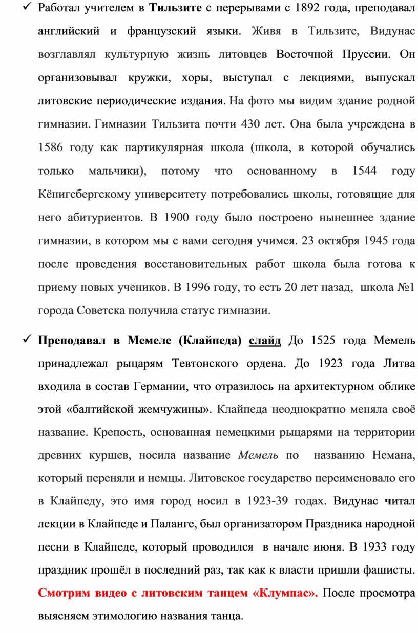 ü Преподавал в Мемеле (Клайпеда) слайд До 1525 года Мемель принадлежал рыцарям Тевтонского ордена. До 1923 года Литва входила в состав Германии, что отразилось на архитектурном облике этой «балтийской жемчужины». Клайпеда неоднократно меняла своё название. Крепость, основанная немецкими рыцарями на территории древних куршев, носила название Мемель по названию Немана, который переняли и немцы. Литовское государство переименовало его в Клайпеду, это имя город носил в 1923-39 годах. Видунас читал лекции в Клайпеде и Паланге, был организатором Праздника народной песни в Клайпеде, который проводился в начале июня. В 1933 году праздник прошёл в последний раз, так как к власти пришли фашисты. Смотрим видео с литовским танцем «Клумпас». После просмотра выясняем этимологию названия танца.