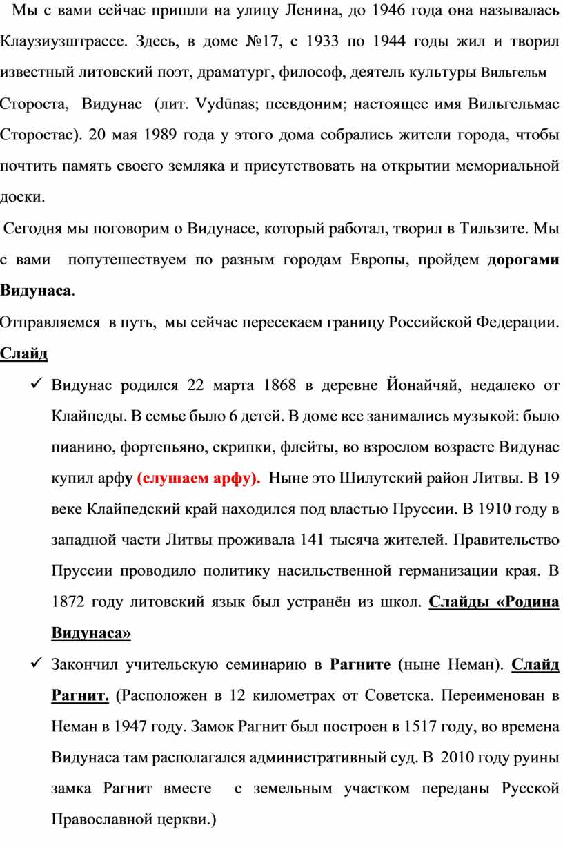 Предварительная работа: ученики 9 класса делятся на группы и самостоятельно готовят информацию о Видунасе. Ребятам необходимо проследить жизненный путь литовского философа, поэтому по группам собирается материал о работе Видунаса в Литве, Тильзите, Германии. Ученикам предоставляется возможность самостоятельно работать с источниками, предлагается посетить Музей истории города, городскую библиотеку имени И.Рутмана, школьный музей, обратиться к ресурсам интернета.