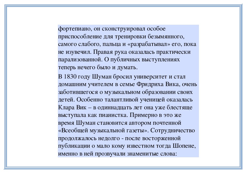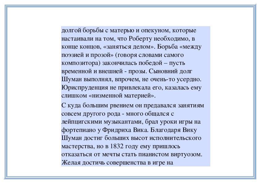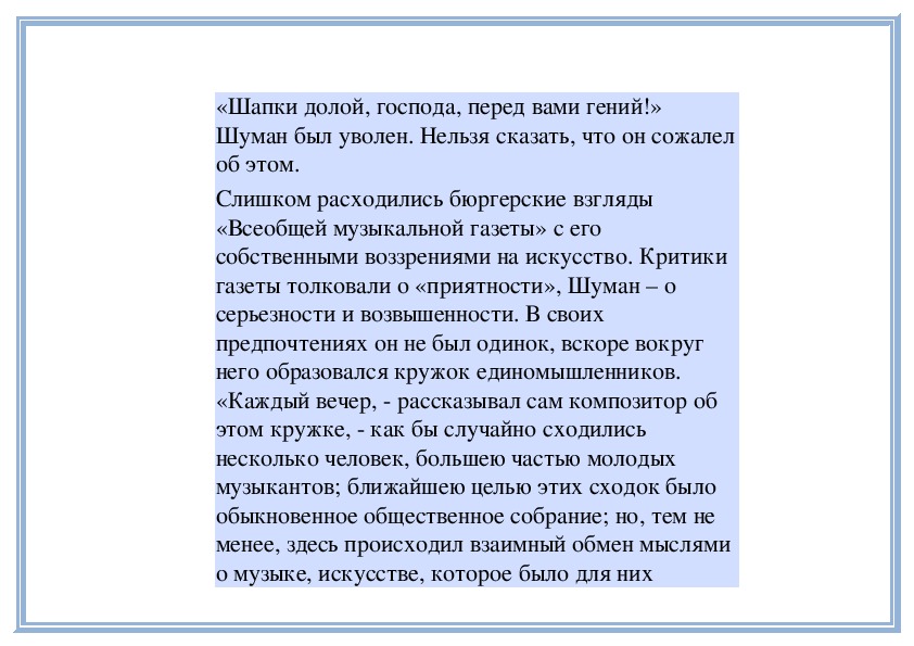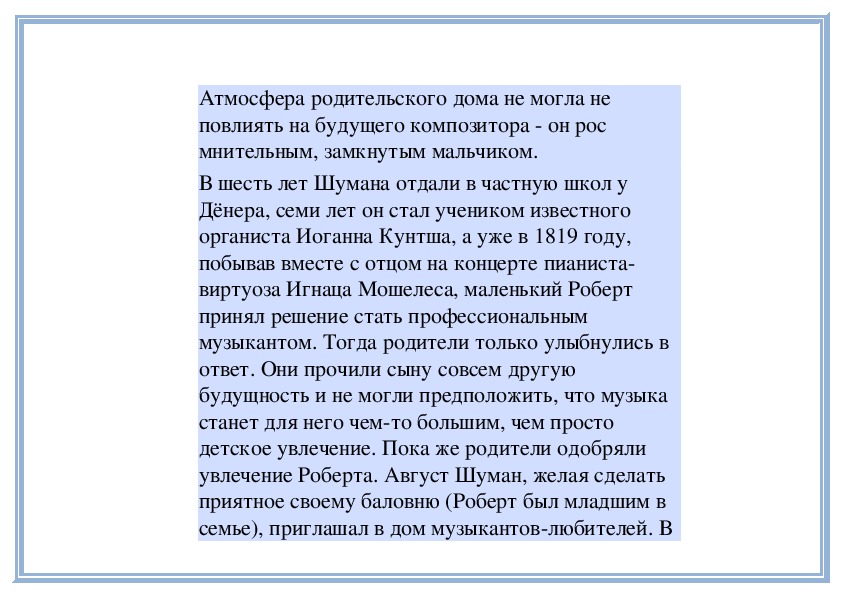 семье), приглашал в дом музыкантовлюбителей. Вгостиной Шуманов часто звучали произведения