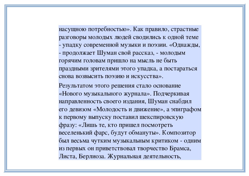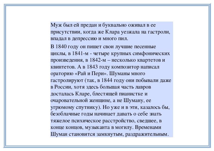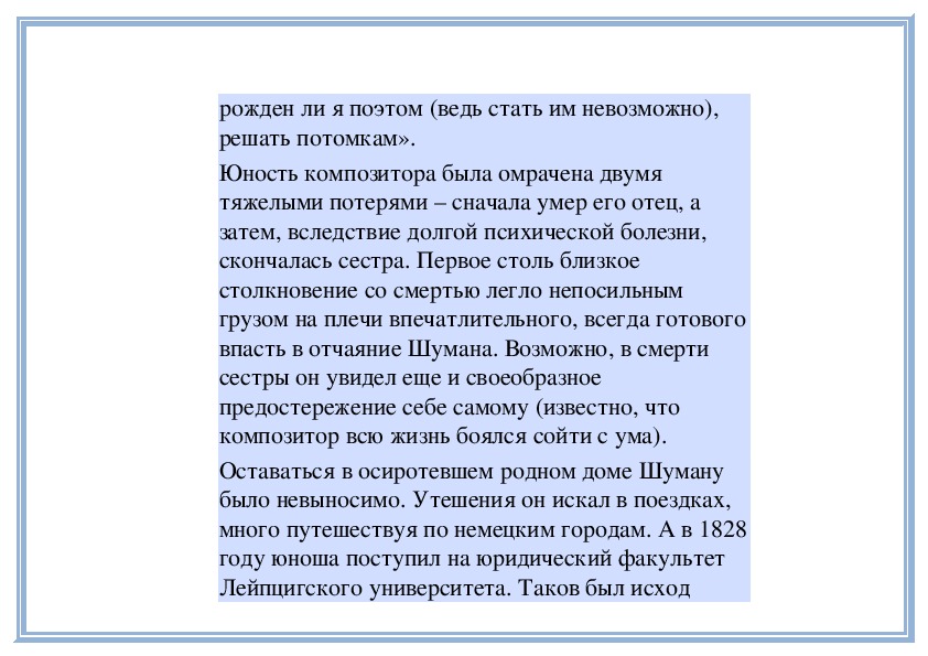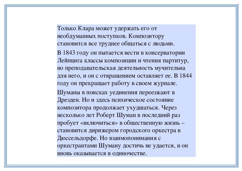 Шуман был тонким интеллектуалом, обладающим пылкой и упрямой натурой. Не только даром, но и крестом стали для Шумана его душевная чуткость и отзывчивость ко всему возвышенному. Композитор окончил свои дни в лечебнице для душевнобольных...
