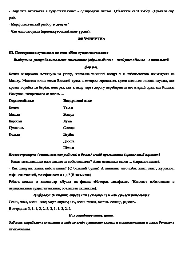ученики должны знать определение имени существительного, одушевлённые и неодушевлённые