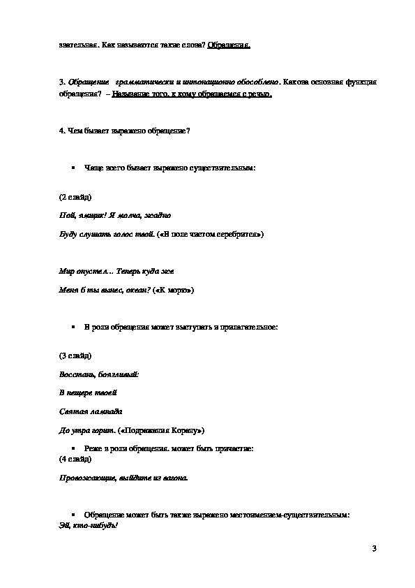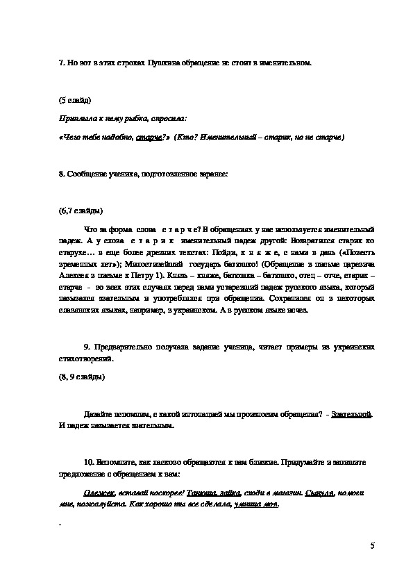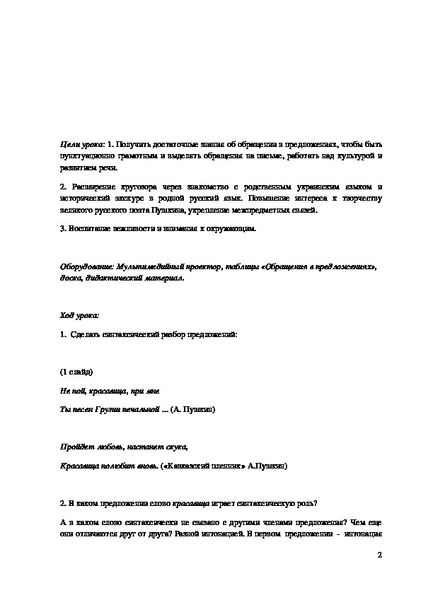 Урок направлен на получение достаточных знаний об обращении в предложениях, чтобы быть пунктуационно грамотным и выделять обращения на письме, работать над культурой и развитием речи; расширяет кругозор через знакомство с родственным украинским языком и исторический экскурс в родной русский язык; повышает интерес к творчеству великого русского поэта Пушкина; воспитывает вежливость и внимание к окружающим.