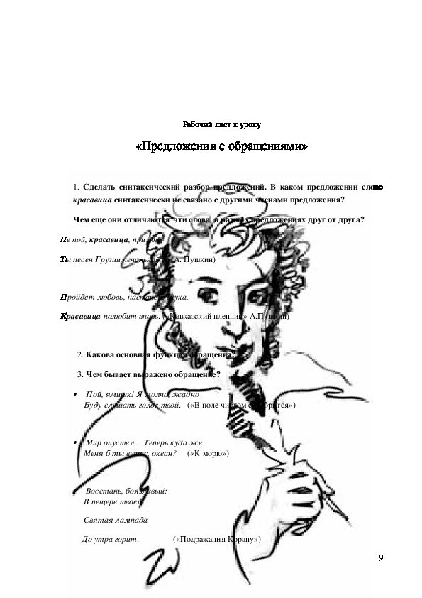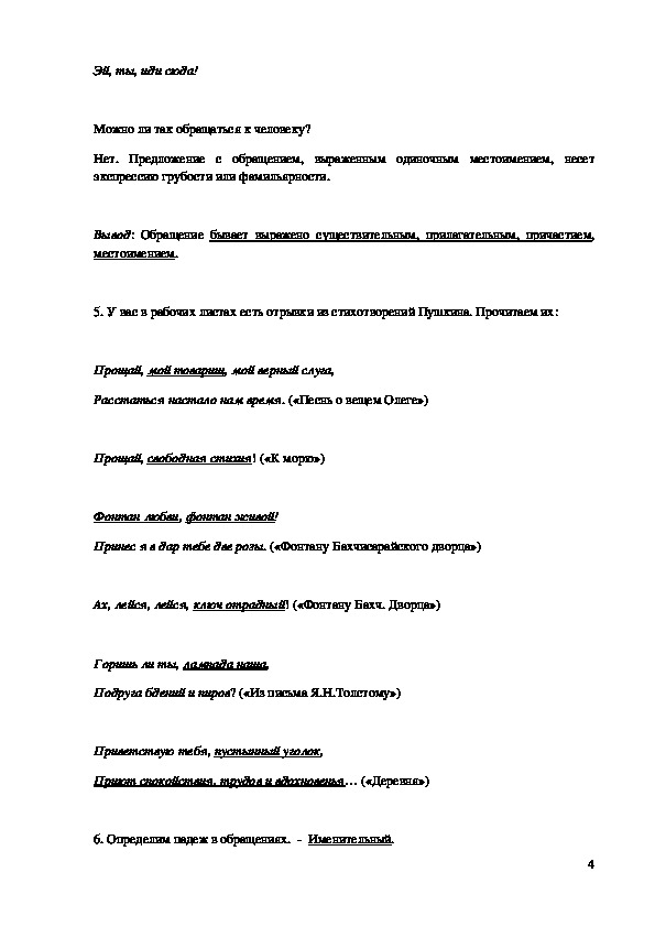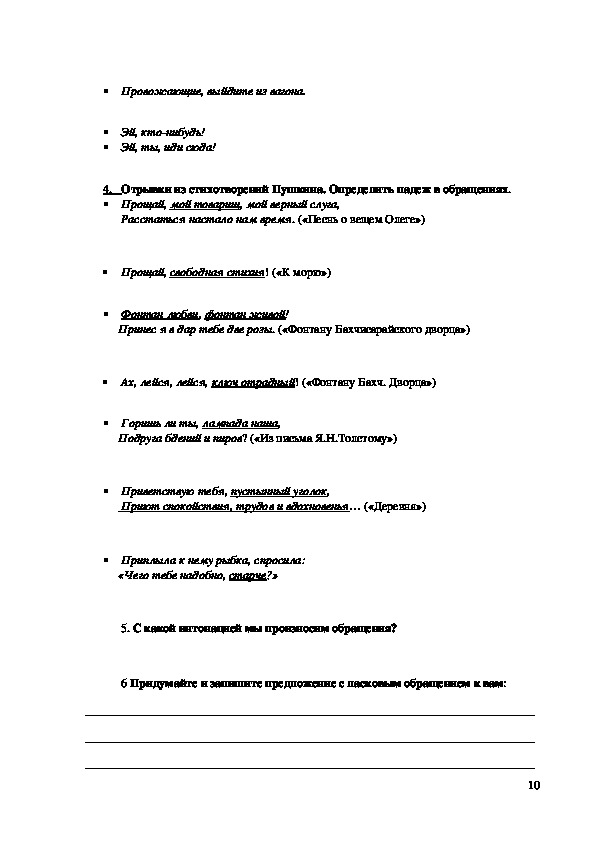 4. Отрывки из стихотворений Пушкина. Определить падеж в обращениях.