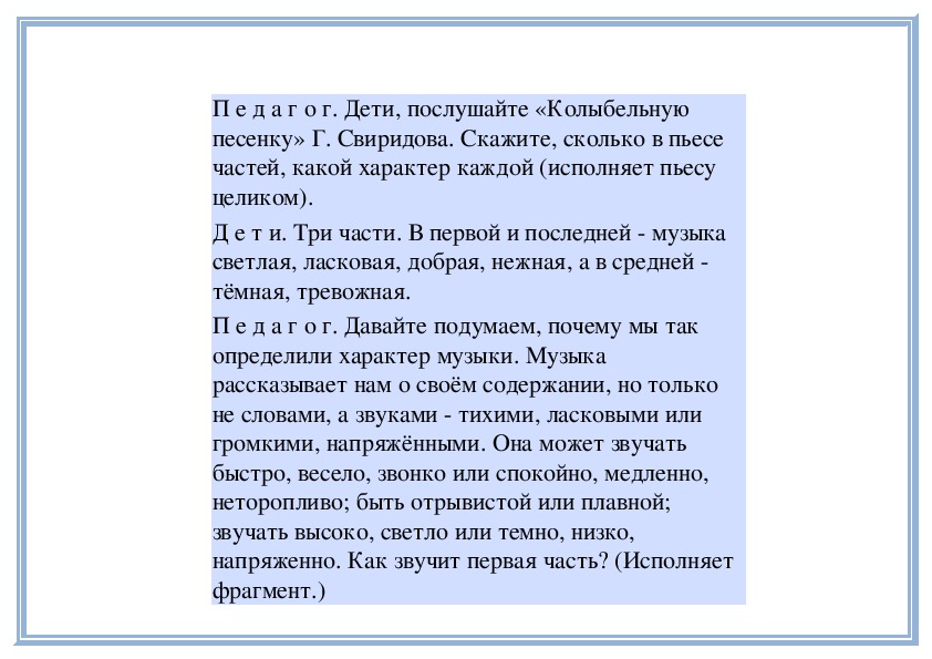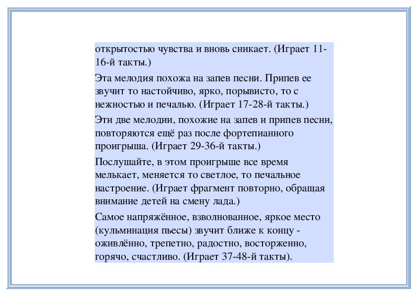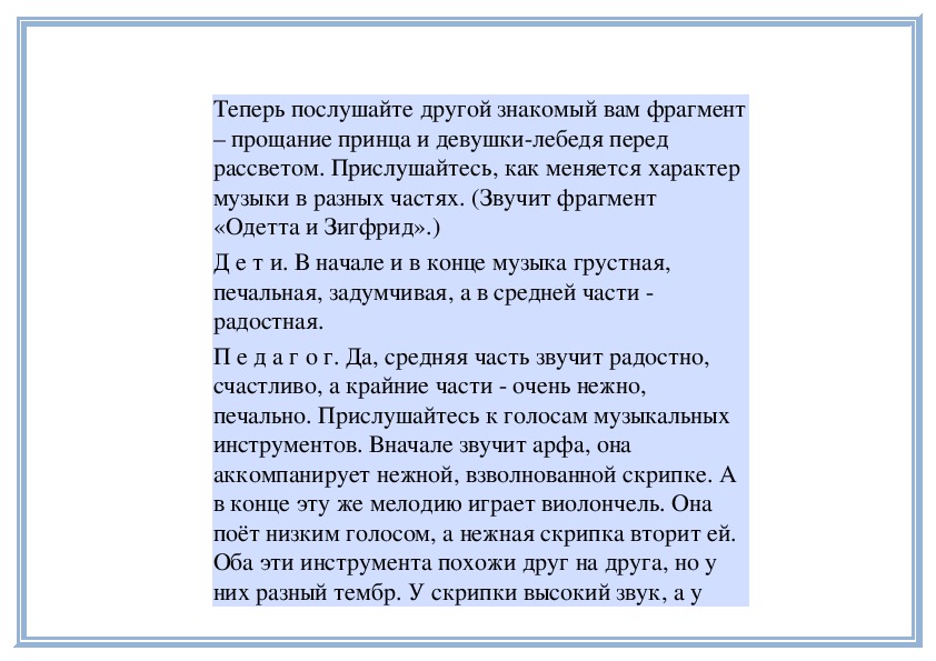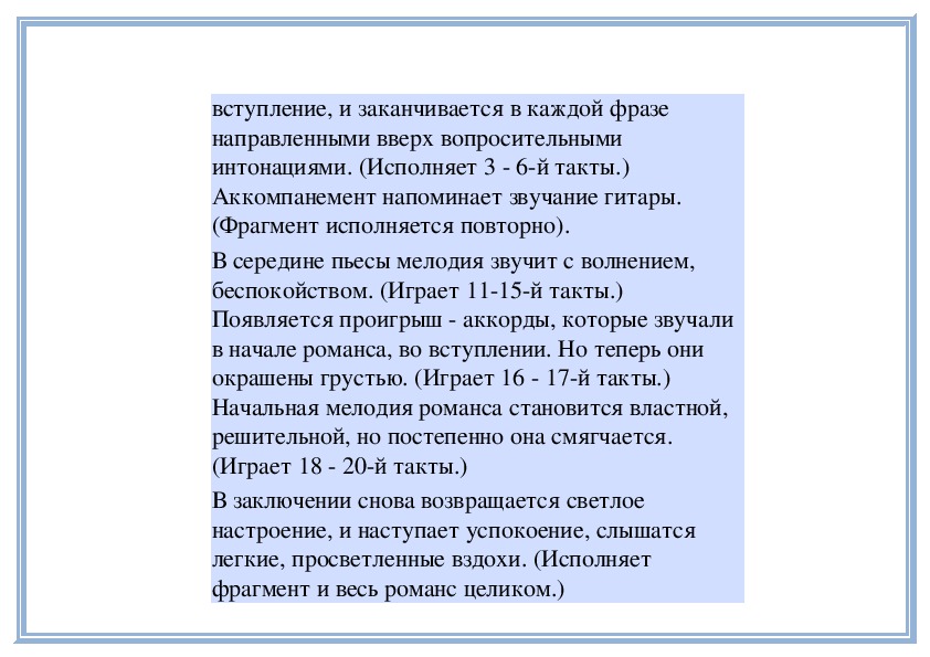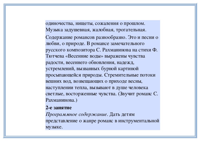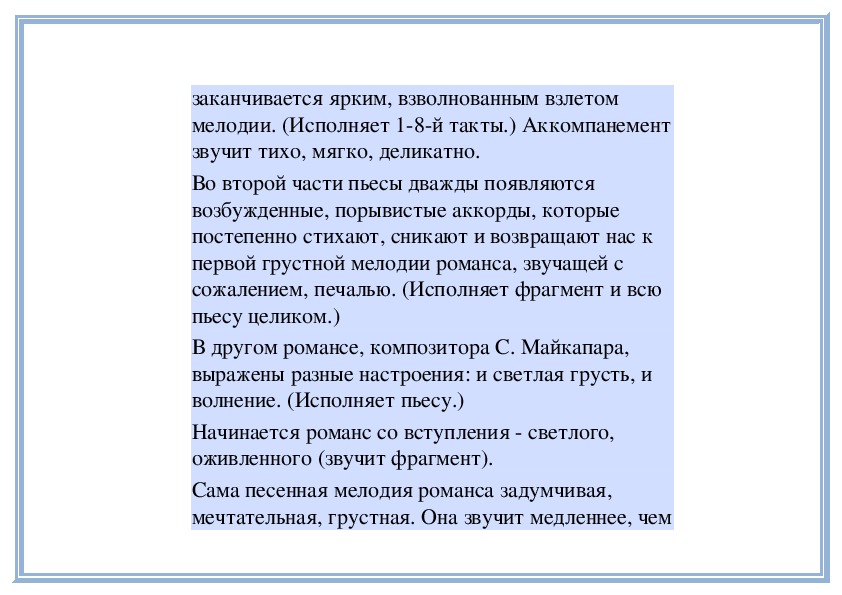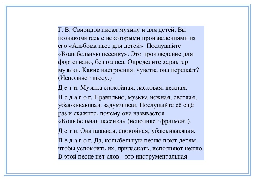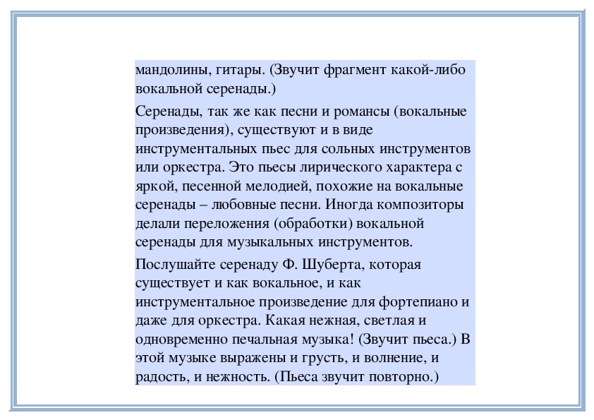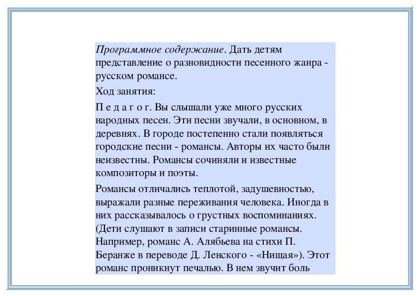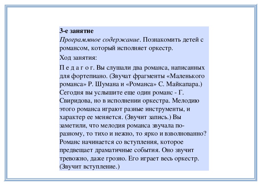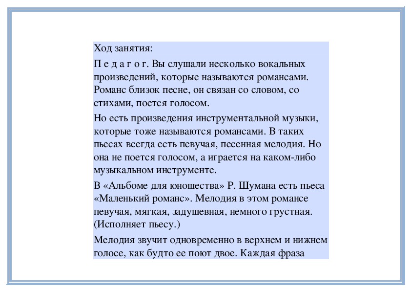 П е д а г о г. Вы знакомы с разными песнями и романсами. Знаете, что песня и романс (вокальные произведения) могут быть написаны и для музыкальных инструментов, без пения. В таких инструментальных произведениях пение заменяет яркая мелодия, которую играет какой-нибудь музыкальный инструмент (или несколько инструментов).