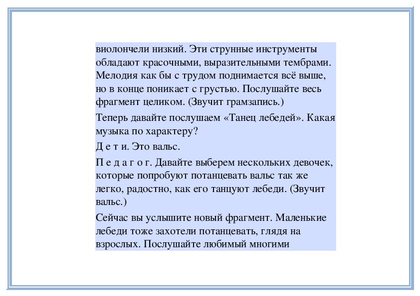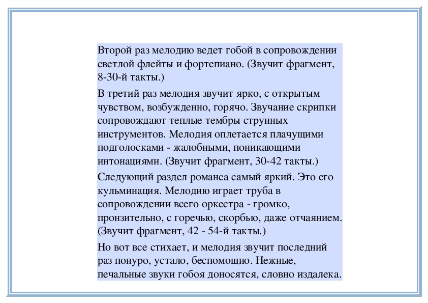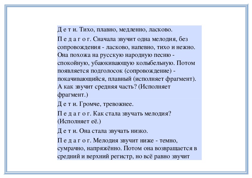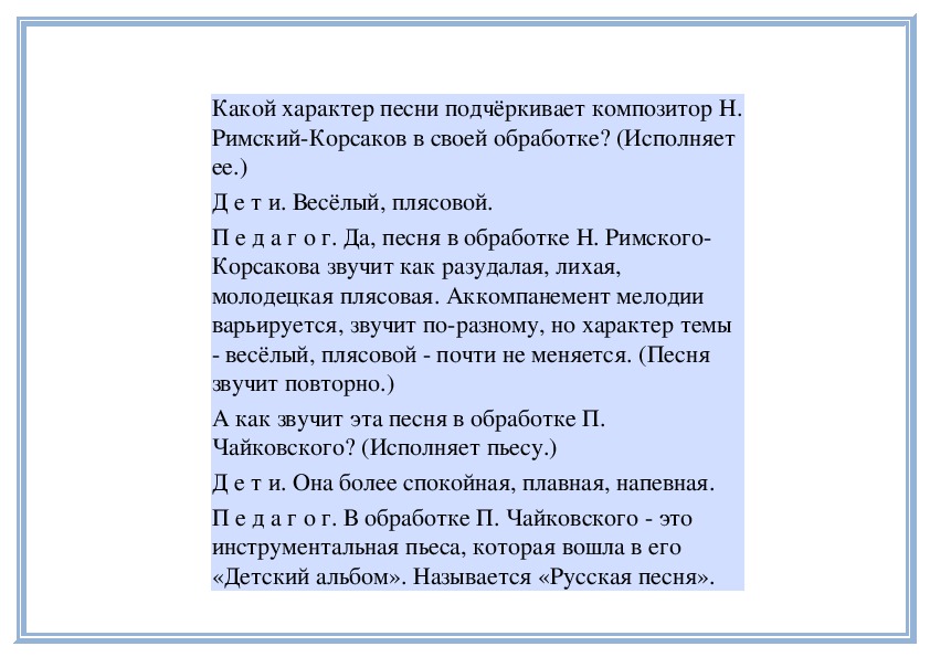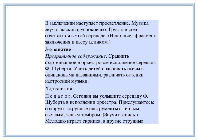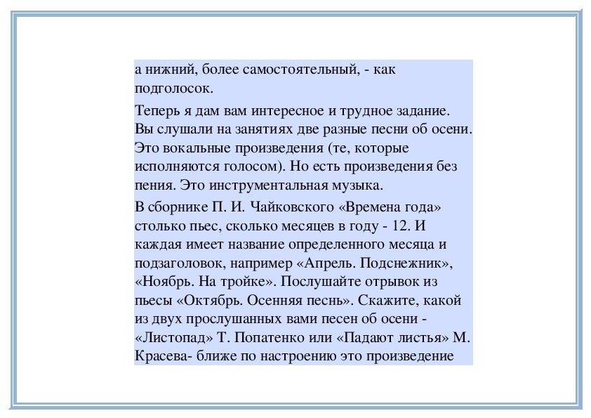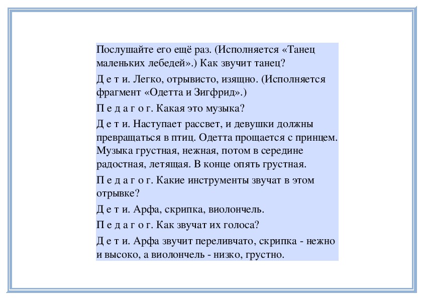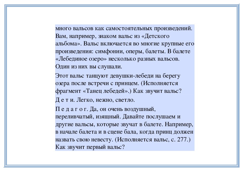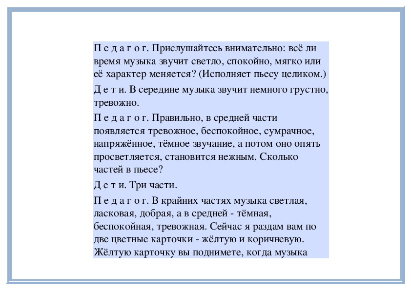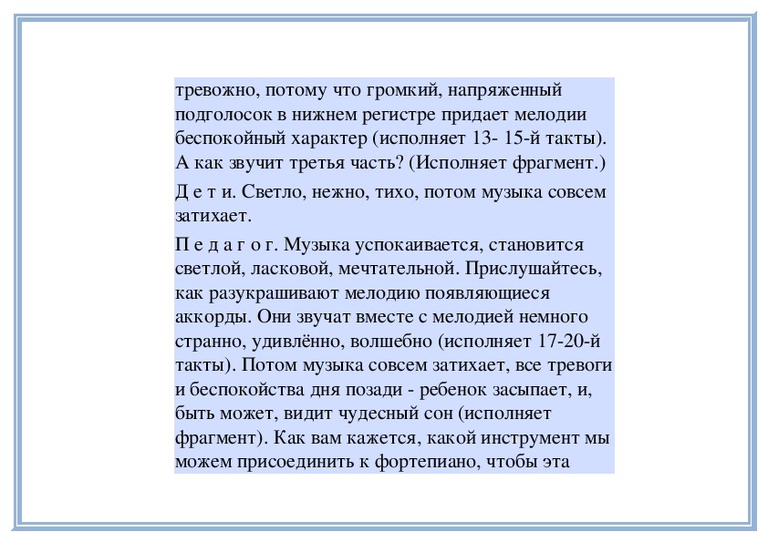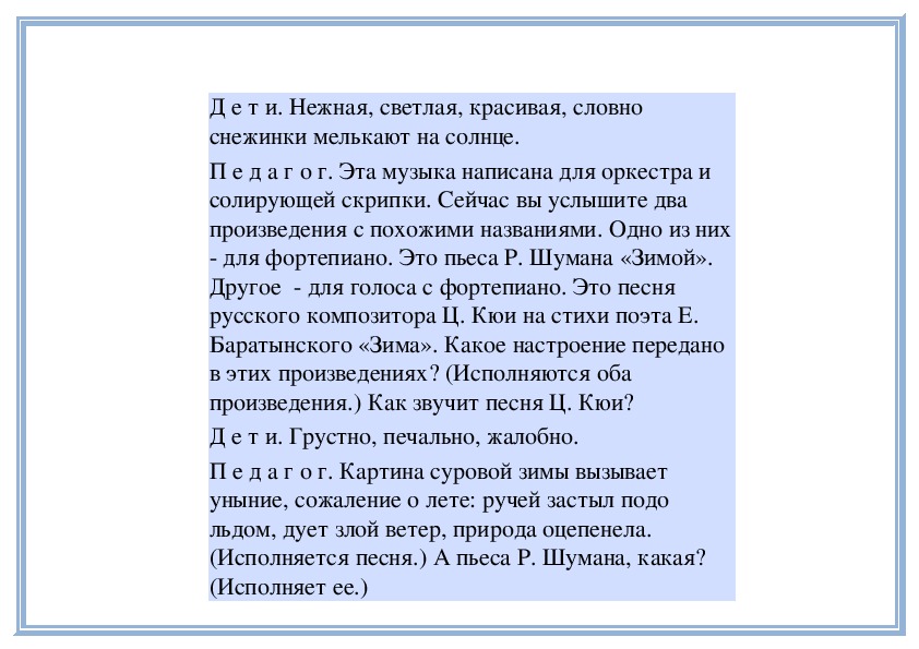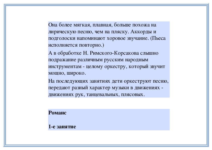 П е д а г о г. Вы знакомы с разными песнями и романсами. Знаете, что песня и романс (вокальные произведения) могут быть написаны и для музыкальных инструментов, без пения. В таких инструментальных произведениях пение заменяет яркая мелодия, которую играет какой-нибудь музыкальный инструмент (или несколько инструментов).