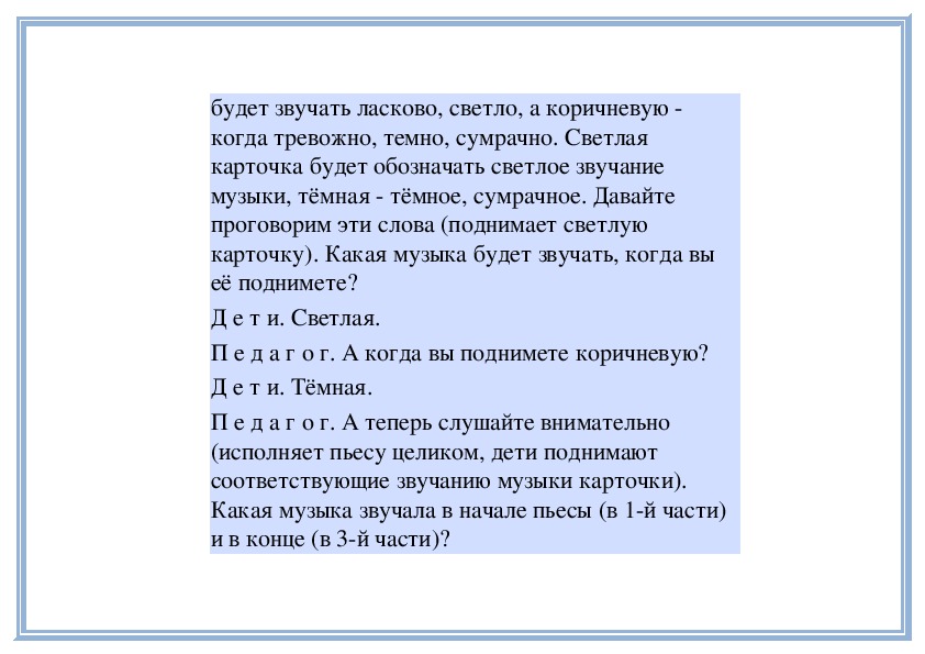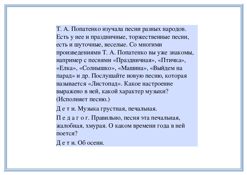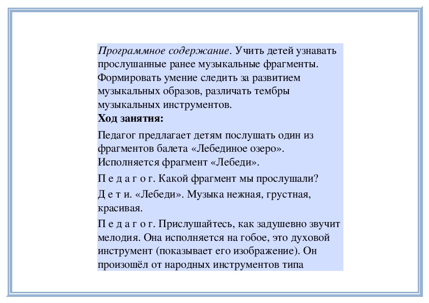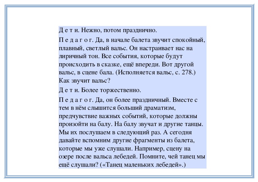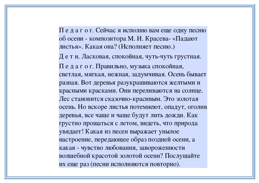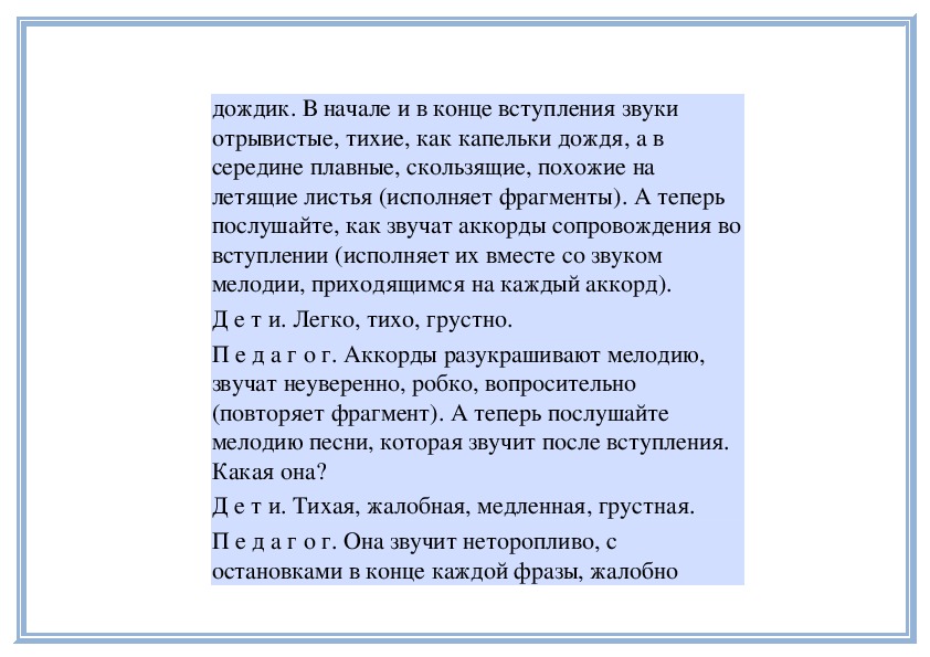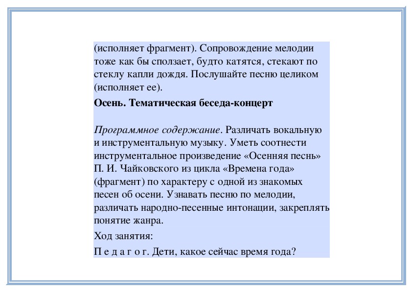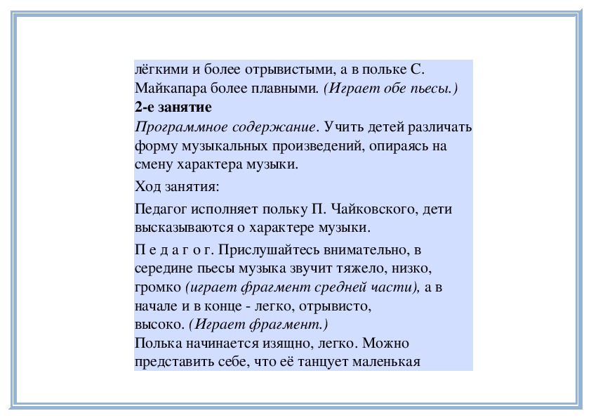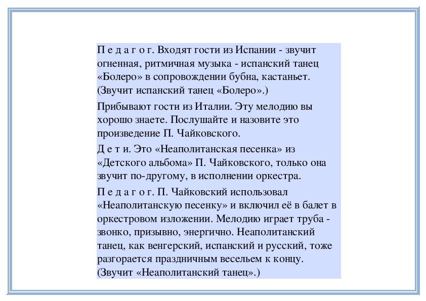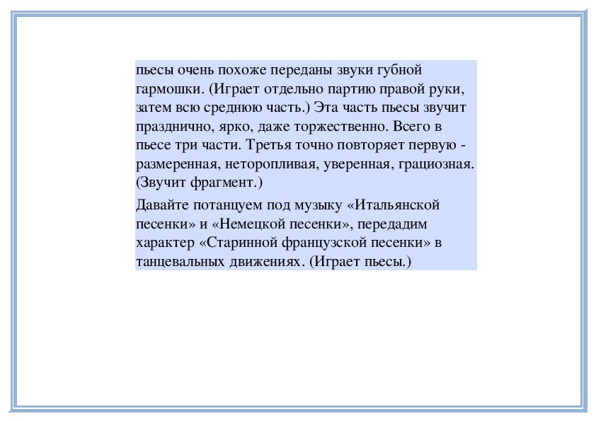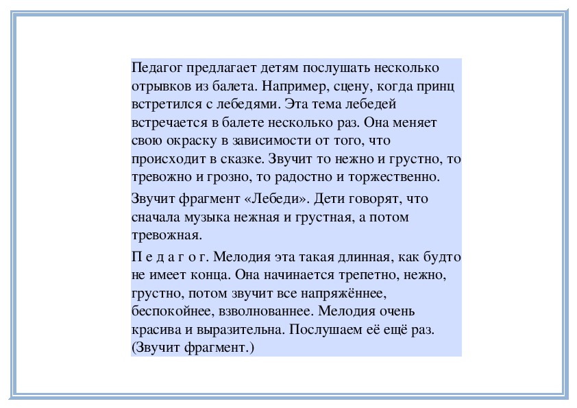 П е д а г о г. Вы знакомы с разными песнями и романсами. Знаете, что песня и романс (вокальные произведения) могут быть написаны и для музыкальных инструментов, без пения. В таких инструментальных произведениях пение заменяет яркая мелодия, которую играет какой-нибудь музыкальный инструмент (или несколько инструментов).