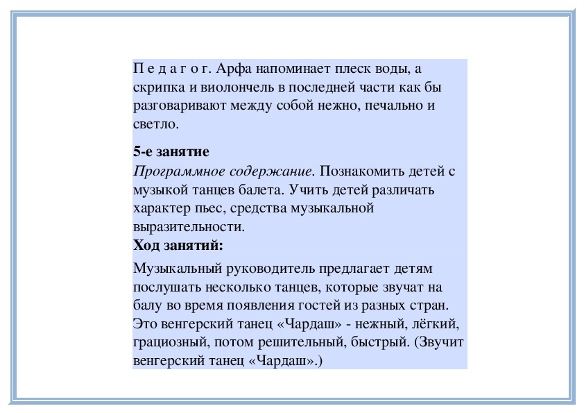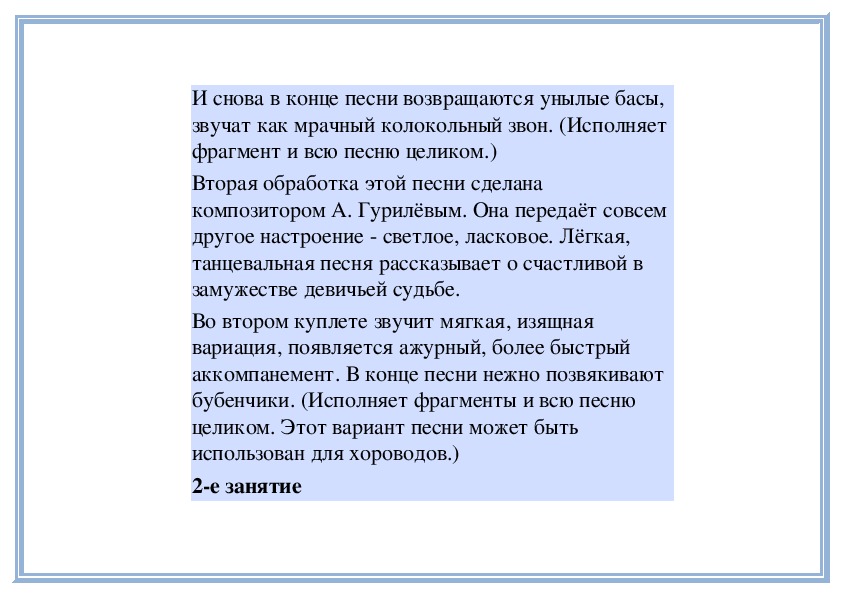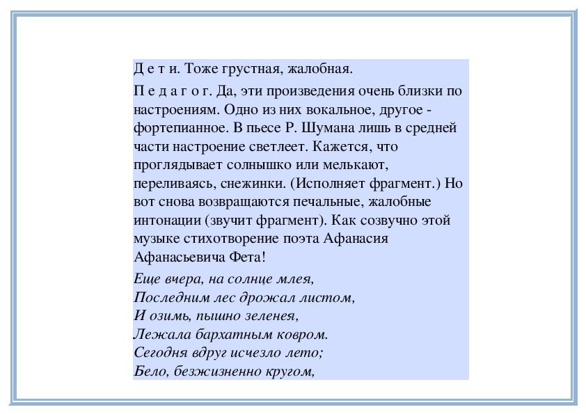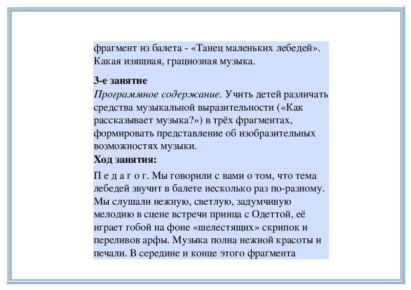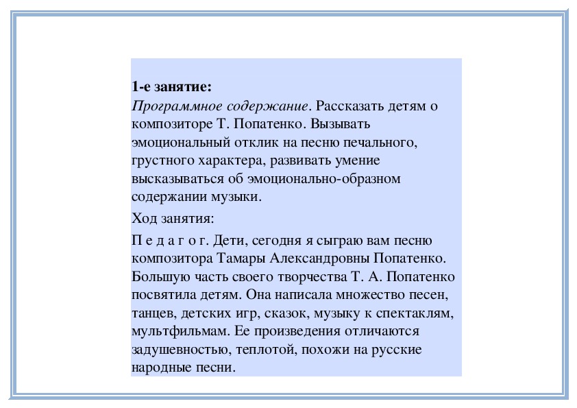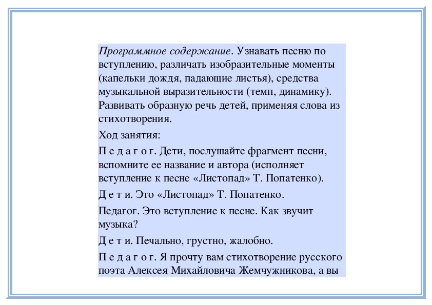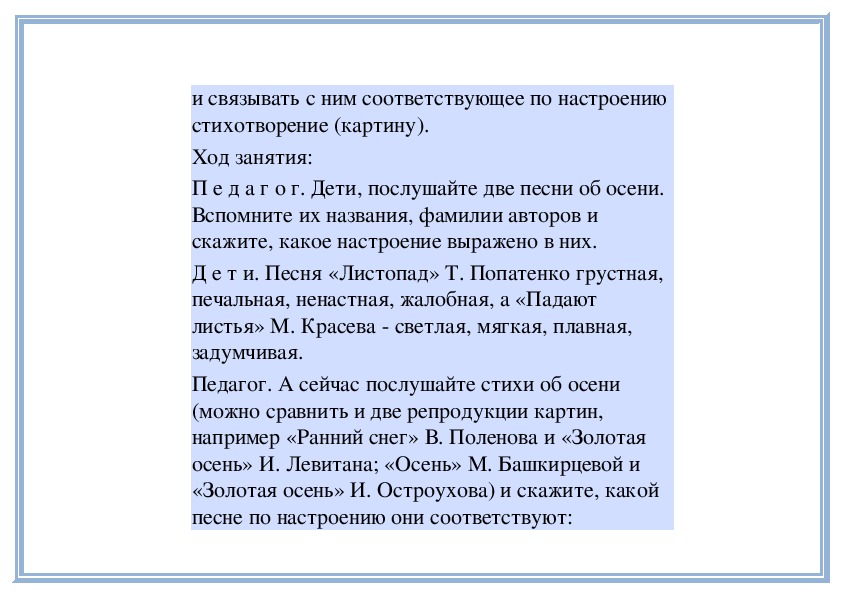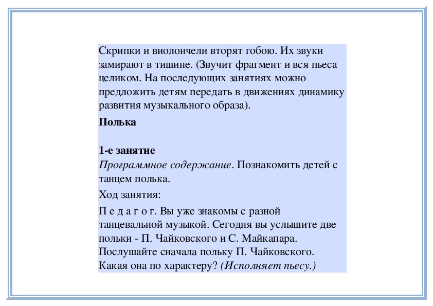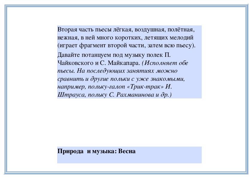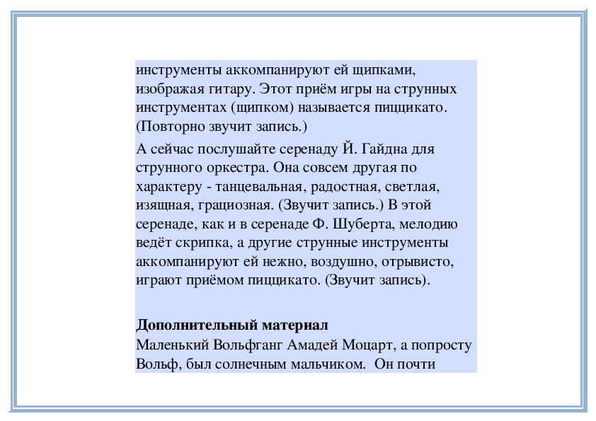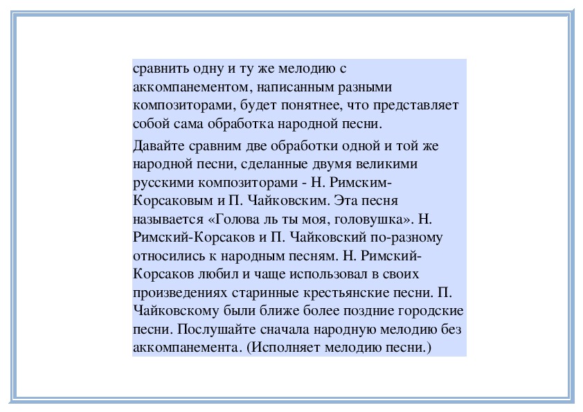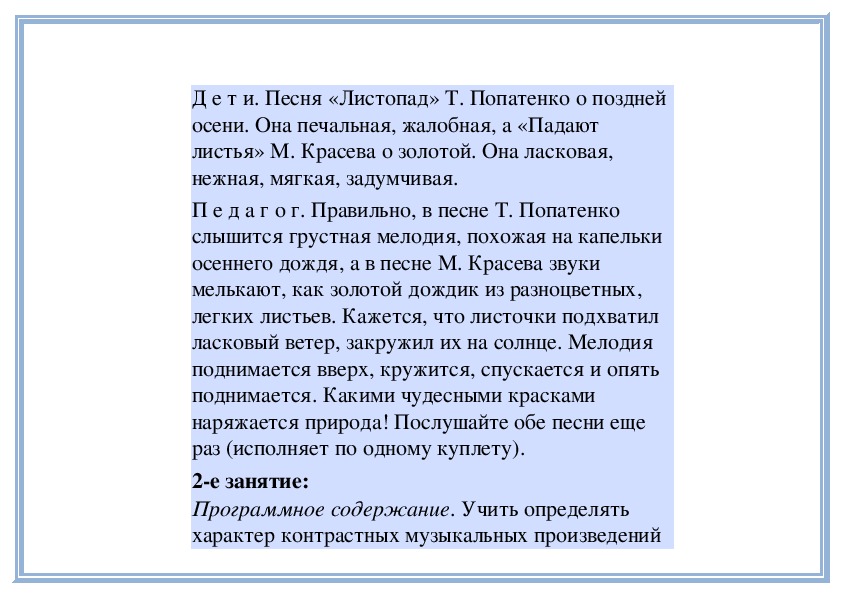 П е д а г о г. Вы знакомы с разными песнями и романсами. Знаете, что песня и романс (вокальные произведения) могут быть написаны и для музыкальных инструментов, без пения. В таких инструментальных произведениях пение заменяет яркая мелодия, которую играет какой-нибудь музыкальный инструмент (или несколько инструментов).