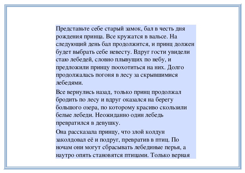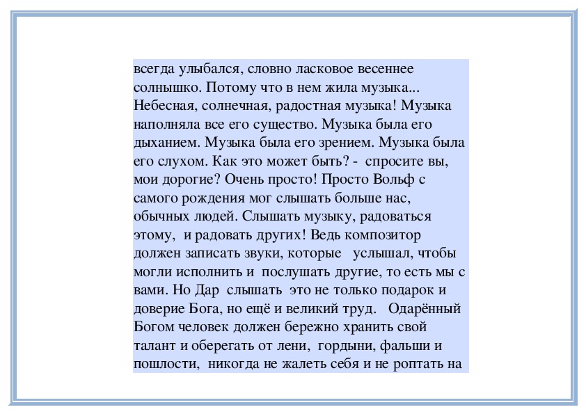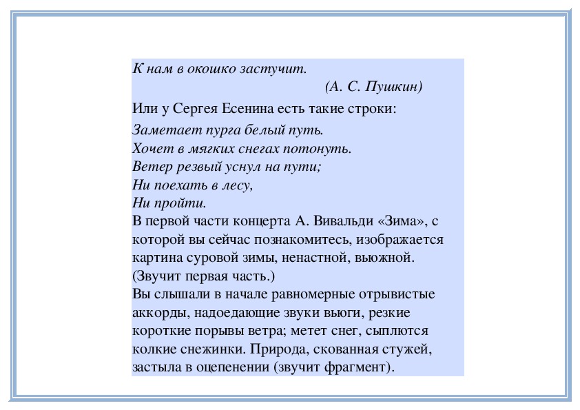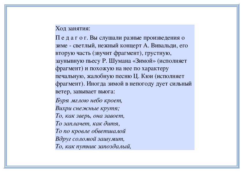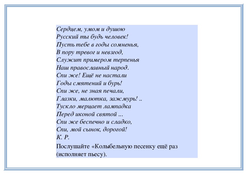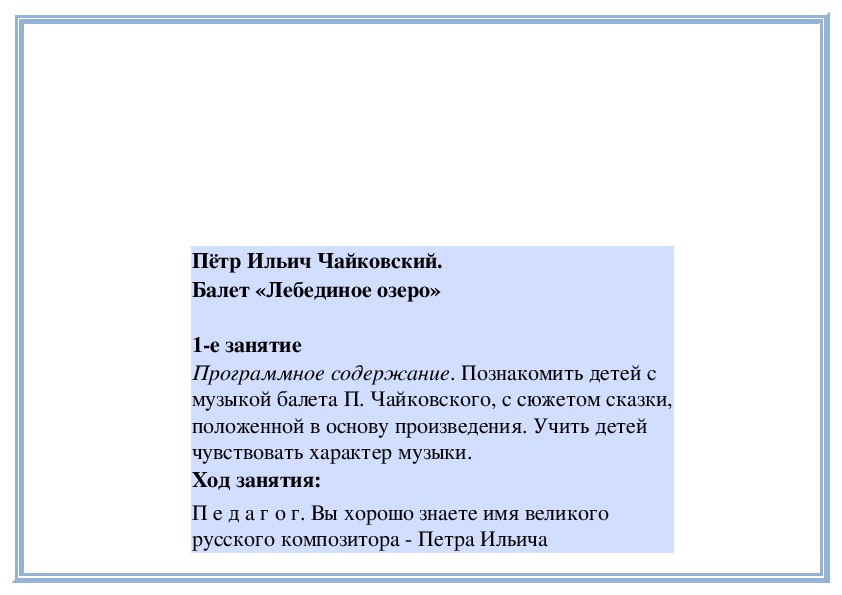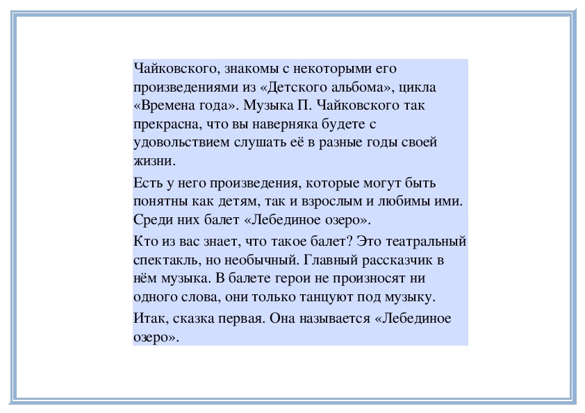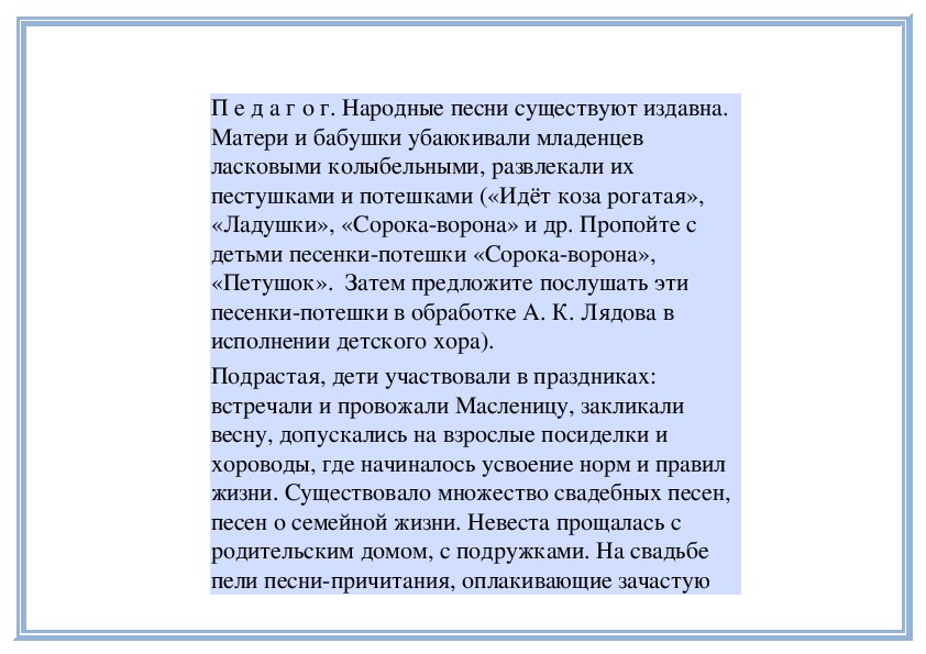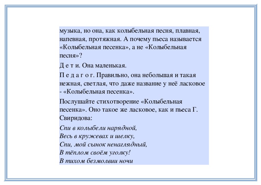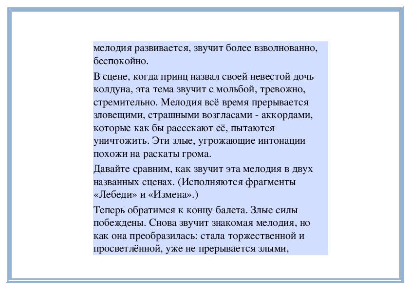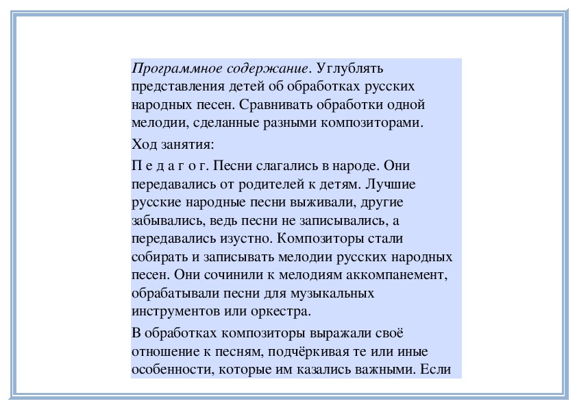 П е д а г о г. Вы знакомы с разными песнями и романсами. Знаете, что песня и романс (вокальные произведения) могут быть написаны и для музыкальных инструментов, без пения. В таких инструментальных произведениях пение заменяет яркая мелодия, которую играет какой-нибудь музыкальный инструмент (или несколько инструментов).