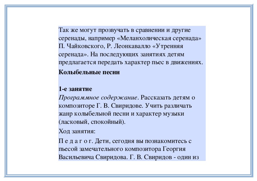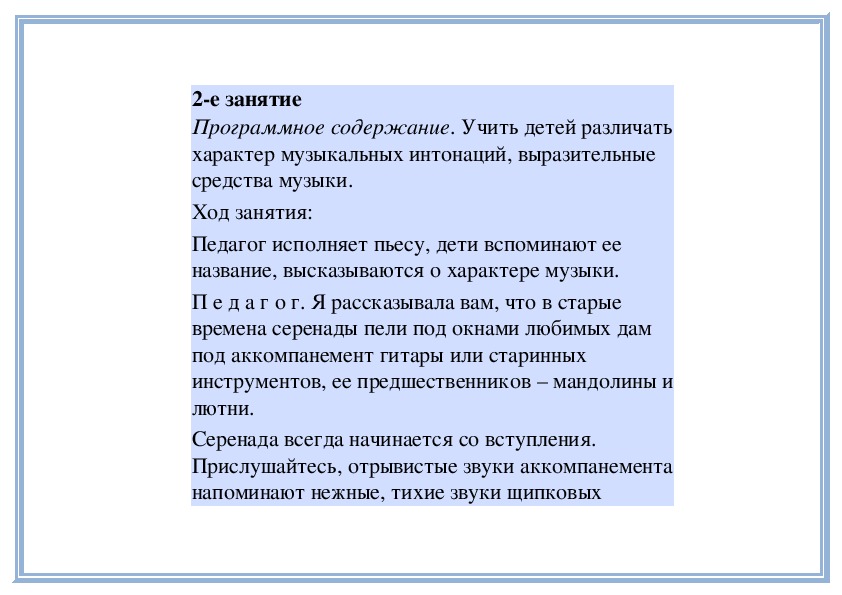 Программное содержание. Познакомить детей с разновидностью песенного жанра - с серенадой.