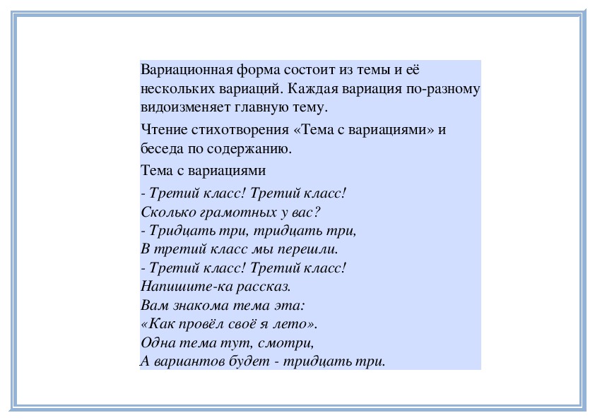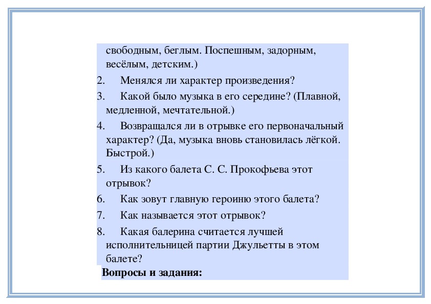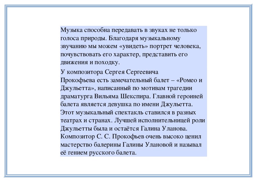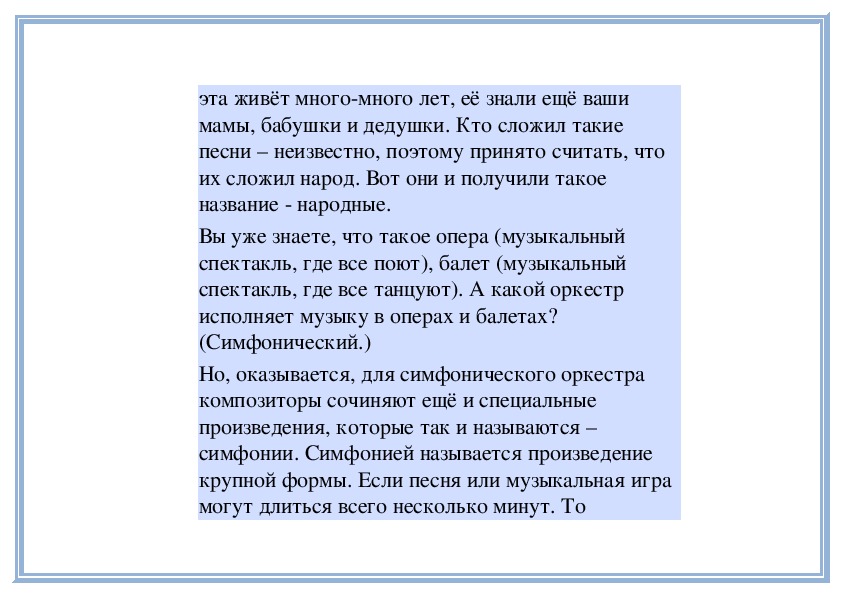 Вы знакомы с разными песнями и романсами. Знаете, что песня и романс (вокальные произведения) могут быть написаны и для музыкальных инструментов, без пения. В таких инструментальных произведениях пение заменяет яркая мелодия, которую играет какой-нибудь музыкальный инструмент (или несколько инструментов).