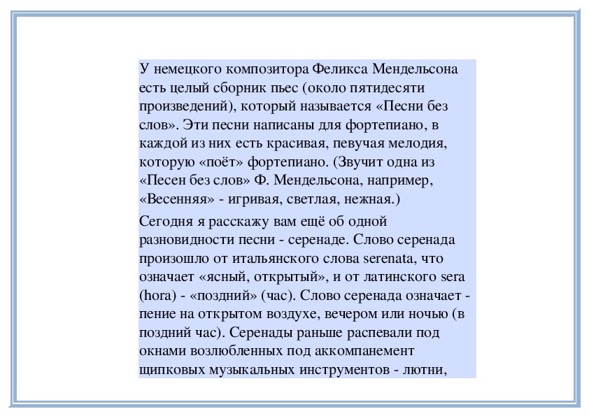 У немецкого композитора Феликса Мендельсона есть целый сборник пьес (около пятидесяти произведений), который называется «Песни без слов». Эти песни написаны для фортепиано, в каждой из них есть красивая, певучая мелодия, которую «поёт» фортепиано. (Звучит одна из «Песен без слов» Ф. Мендельсона, например, «Весенняя» - игривая, светлая, нежная.)
