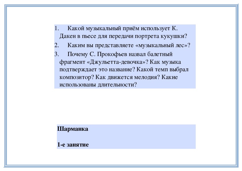 радость, и нежность. (Пьеса звучит повторно.)2е занятие