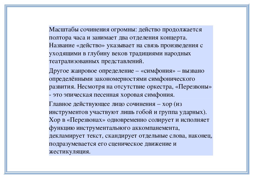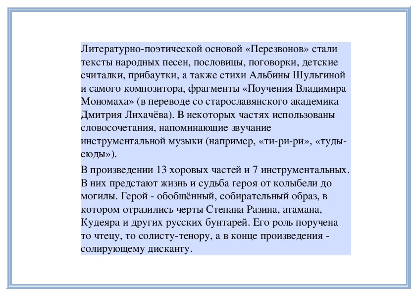 «Перезвоны» - вершина творчества Гаврилина. Это грандиозная фреска истории человека и его народа, их общей судьбы.