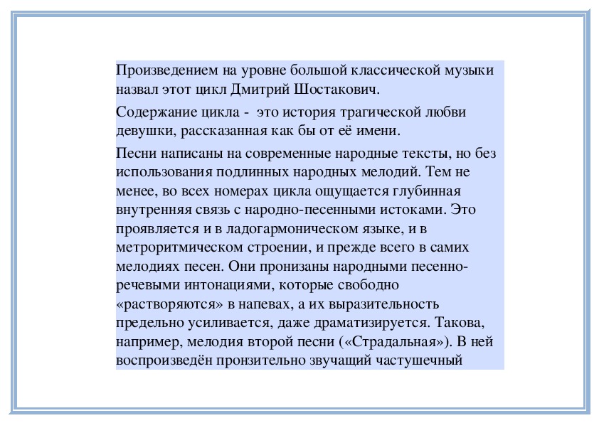 «По моему замыслу, - говорил композитор, - сочинение должно передать душевную жизнь народа через судьбу одного человека - от рождения, через детство и юность, зрелость. К концу - бесконечная дорога, по которой идут люди, поколение за поколением, образы дороги, пути, реки жизни...»